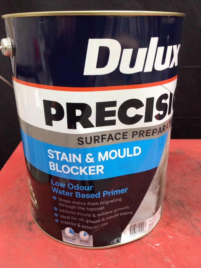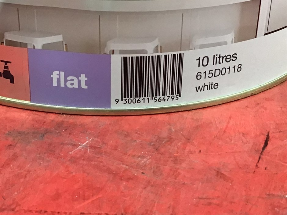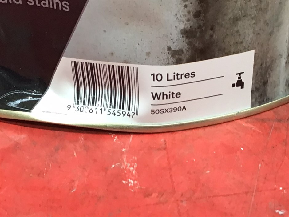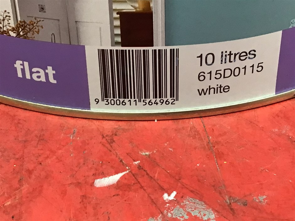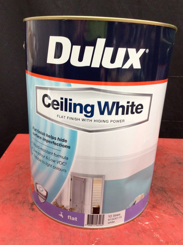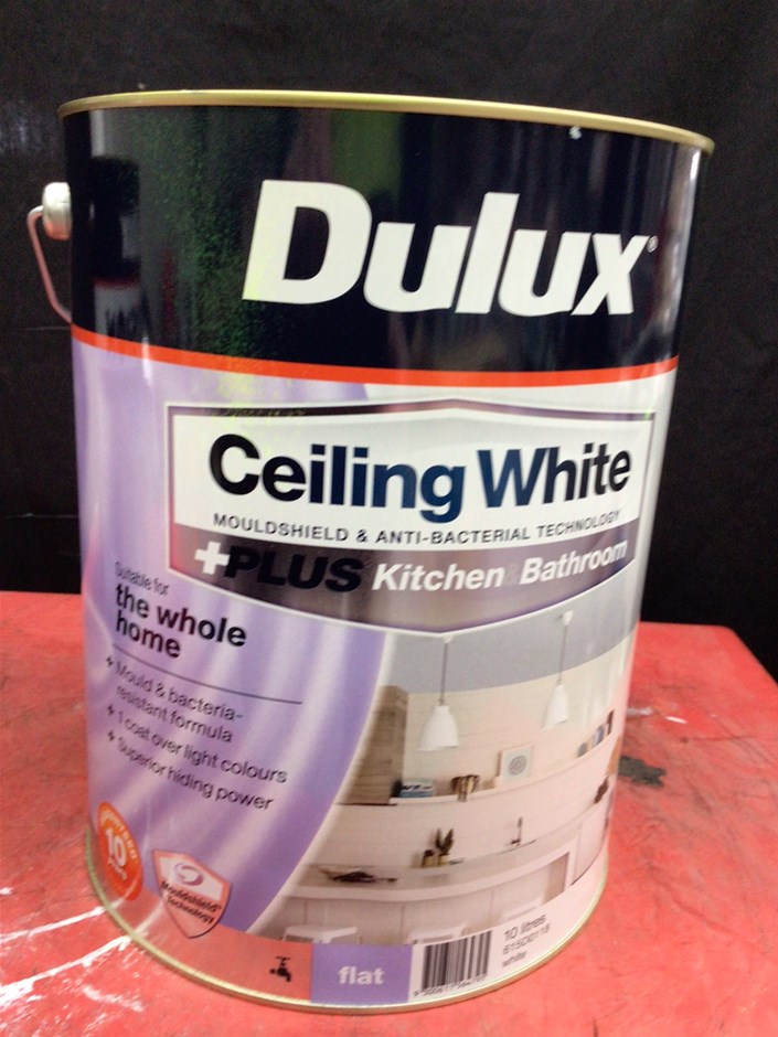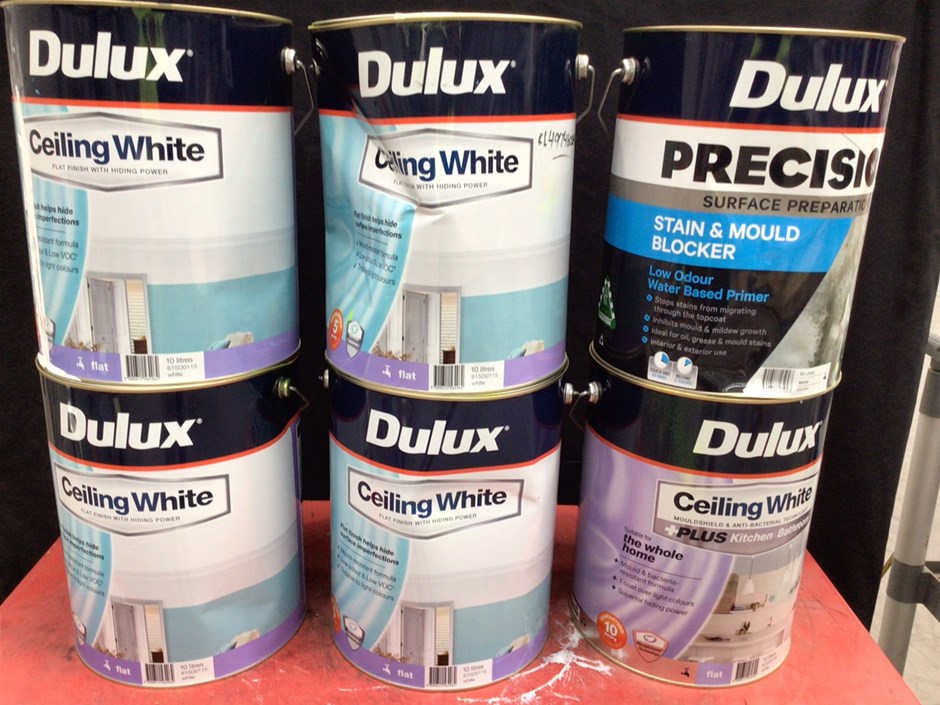 • 6 x 10 Litre Tins of Assorted Dulux Paint. Comprising, 4 x Ceiling White, Flat finish. 1 x Ceiling White +Plus Kitchen Bathroom, Flat finish. 1 x PRECISION Surface Preparation Stain & Mould Blocker. Colour White