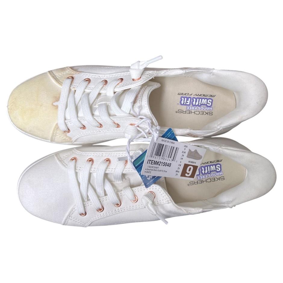 SKECHERS Women`s Bob`s Swift Fit Shoes, Size US9, White (WHT), 179228CS. NB: front top of right shoe is stained (shop soil). (Code: 215048-WHI-9-S1) (332135-18)