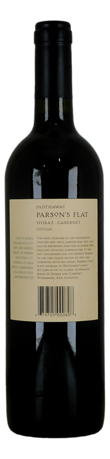 The **Padthaway Parson’s Flat Shiraz Cabernet 2005** is a mature, well-structured wine that showcases the power and complexity of this classic blend. On the nose, it presents rich aromas of dark fruits like blackberry, blackcurrant, and plum, with complementary hints of chocolate, black pepper, and a touch of cedar. The palate is full-bodied, offering a seamless integration of bold dark fruit flavors, spice, and savory elements, along with subtle earthy notes and a bit of vanilla from oak aging. The tannins are smooth yet firm, providing structure and depth, while the acidity balances the richness. The finish is long and refined, with lingering notes of fruit, spice, and a touch of oak. This wine has aged gracefully, delivering a well-rounded, harmonious experience.