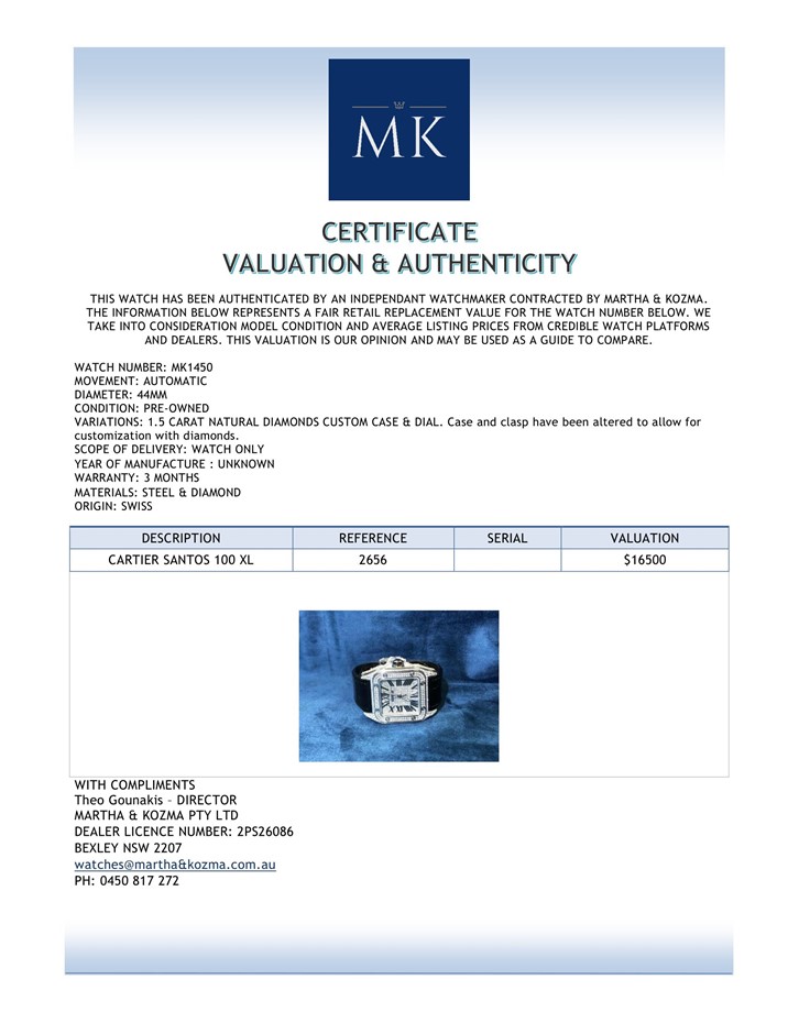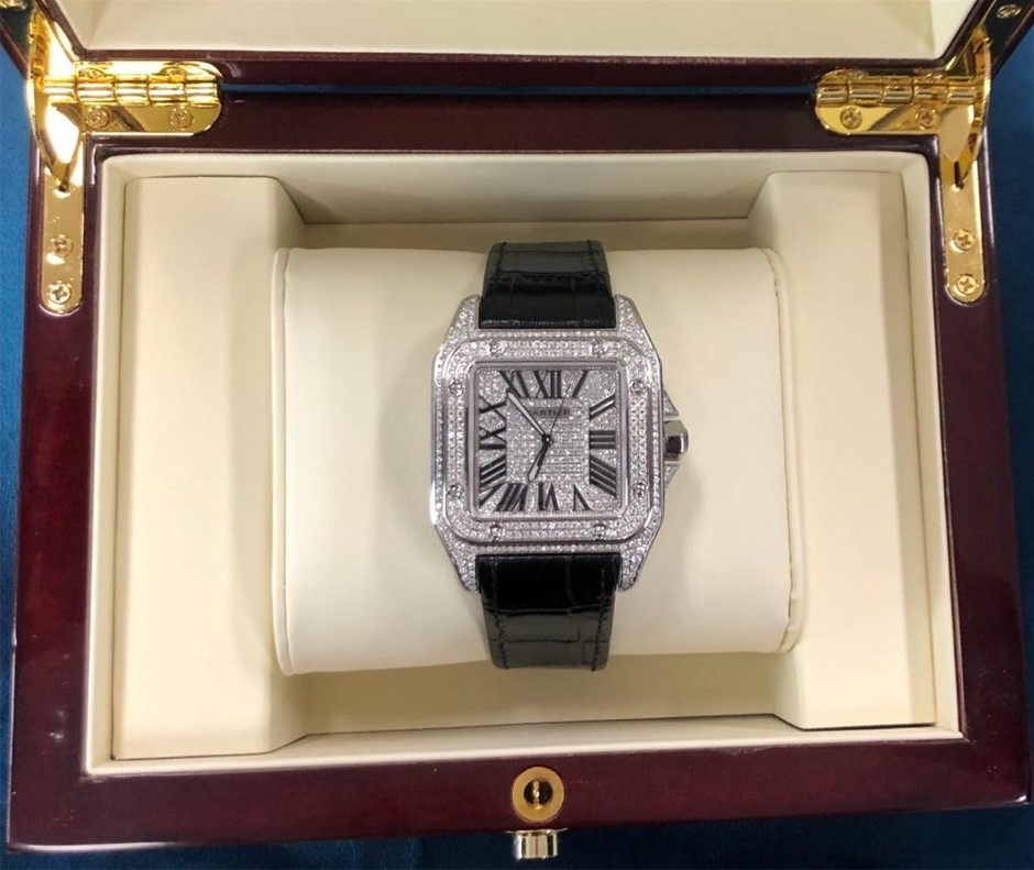 CARTIER SANTOS 100 XL 1.5 CARAT NATURAL DIAMOND CUSTOM CASE & DIAL