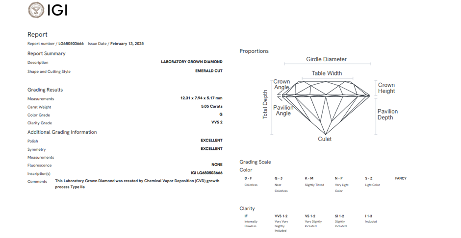 5.05 Carats G/VVS2 Lab Grown Diamond - IGI Certified