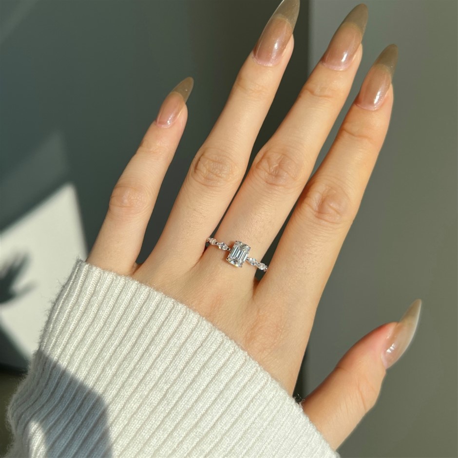 1.0ct Rectangle GRA Certified Moissanite 925 Sterling Silver Ring - Size 7
