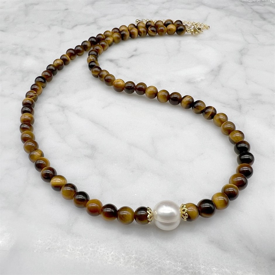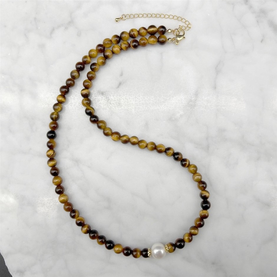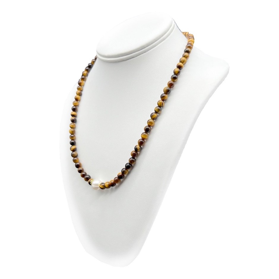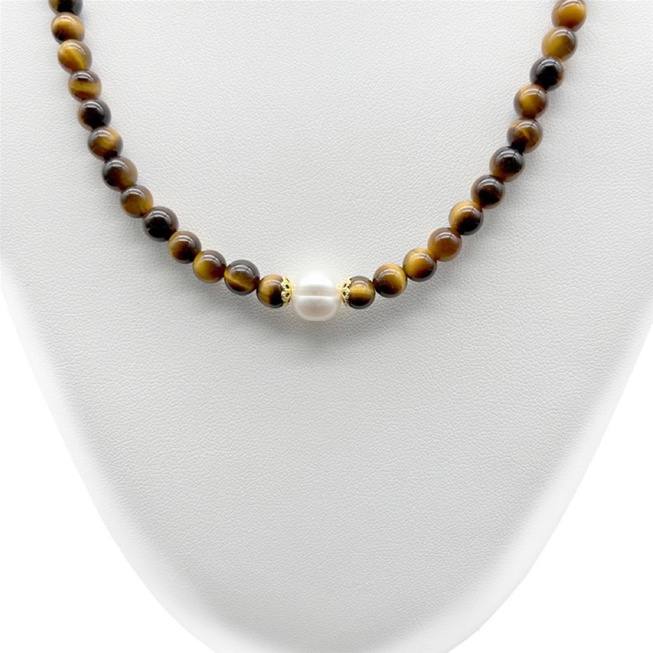 Natural 10mm White Freshwater Pearls with Tiger Eye Gemstone Necklace. Product Specifications: