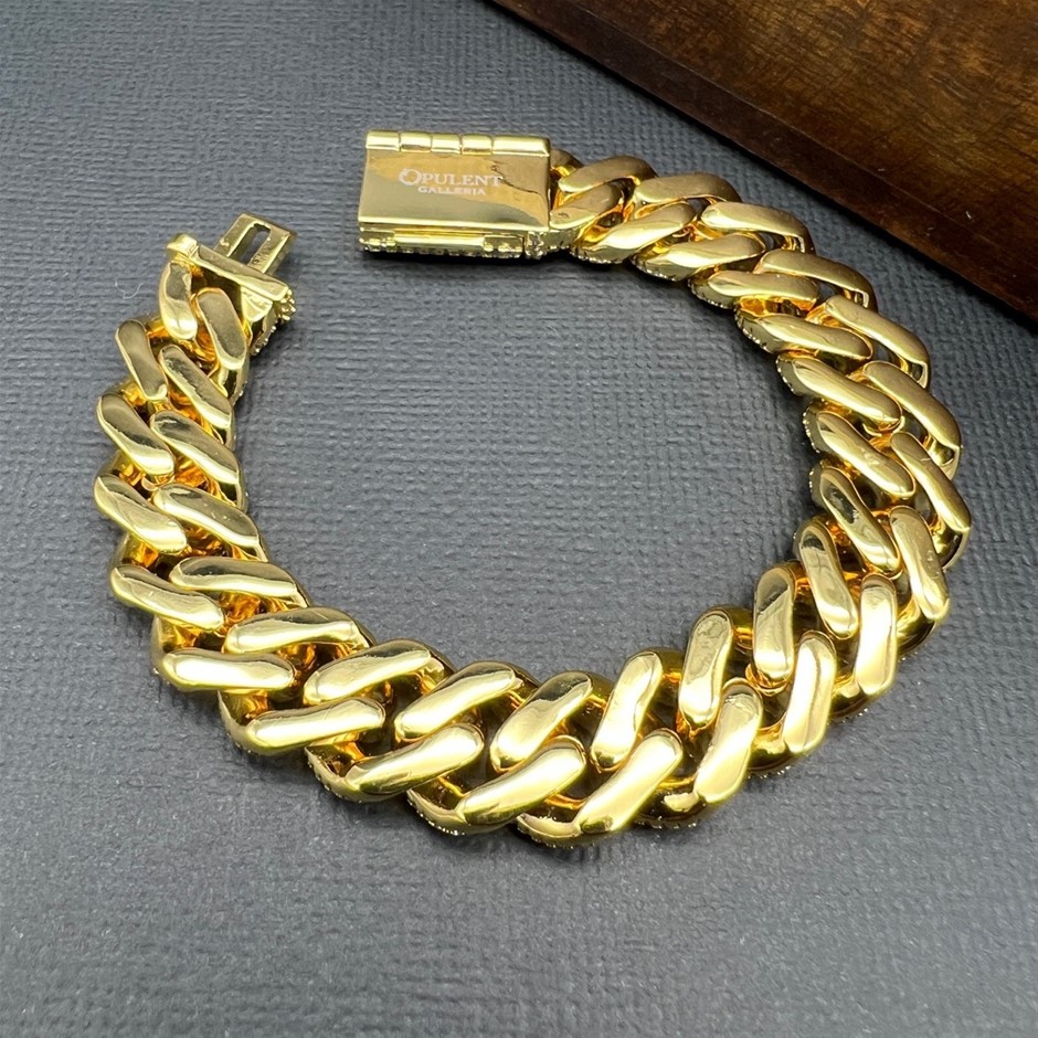 Opulent Galleria - 18K Gold-Filled Cuban Chain Bracelet with Simulated Diamonds, 12MM Wide – 17.8cm