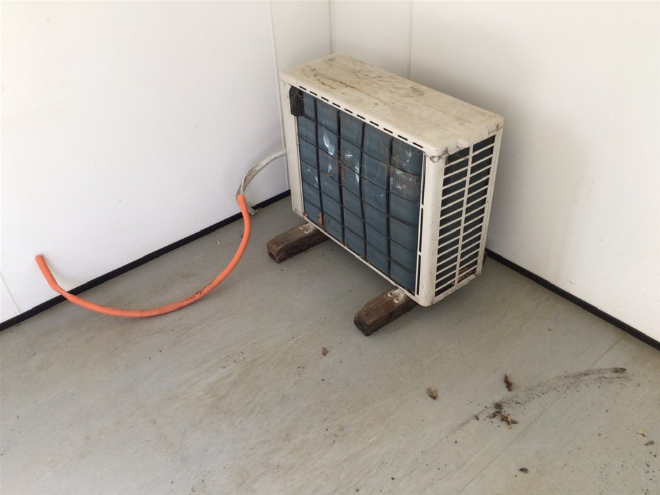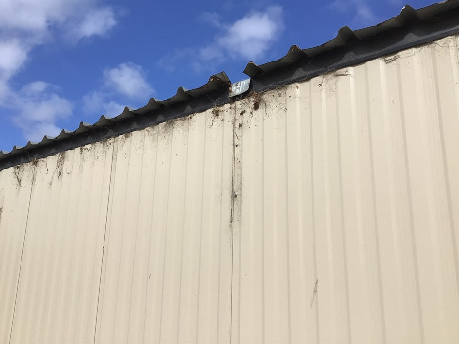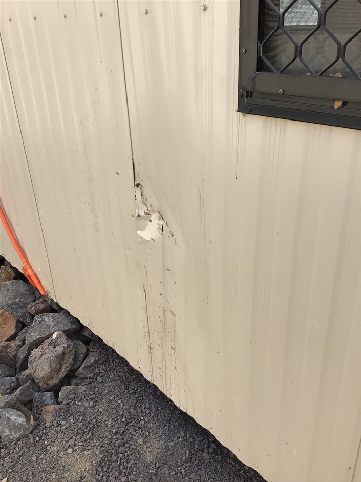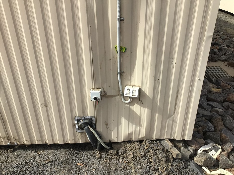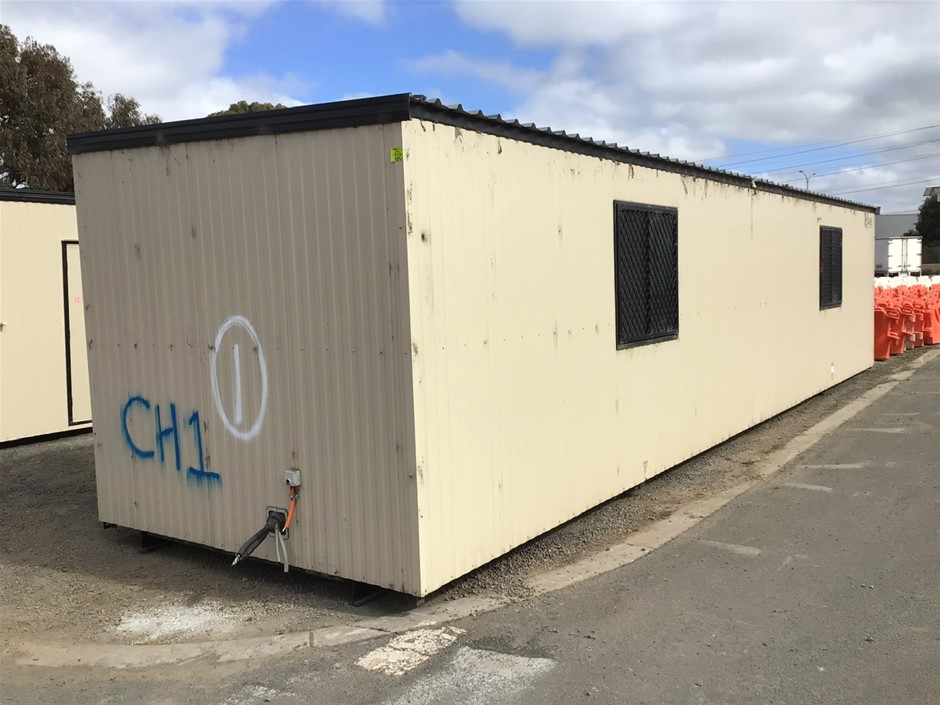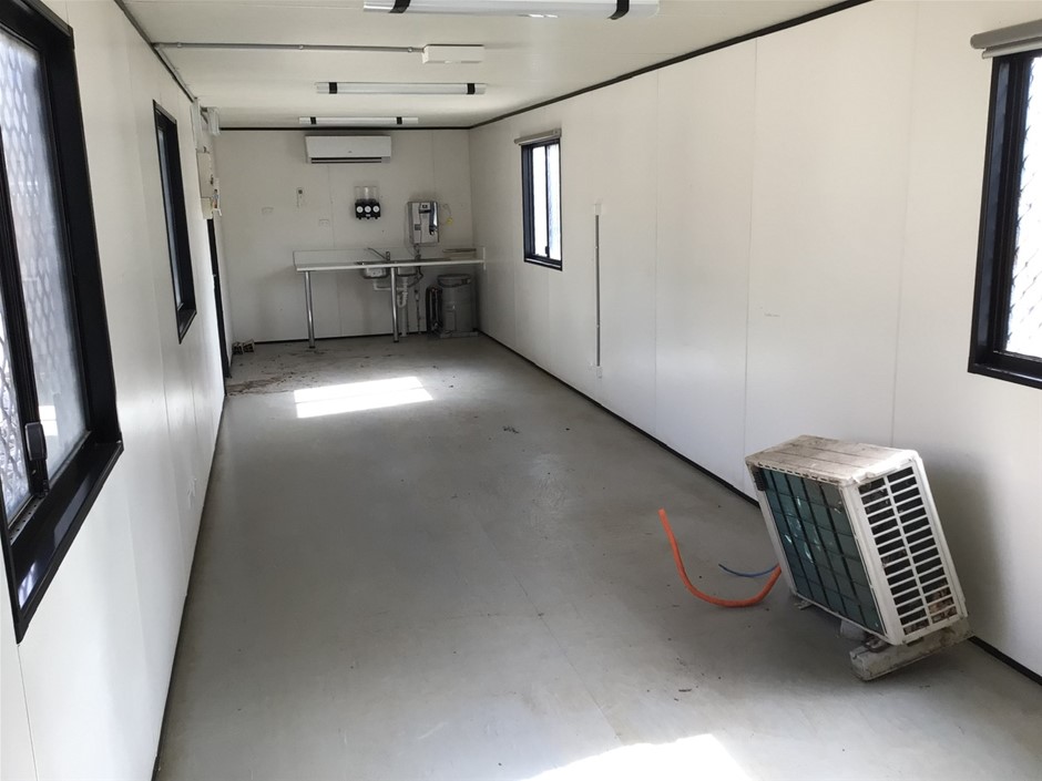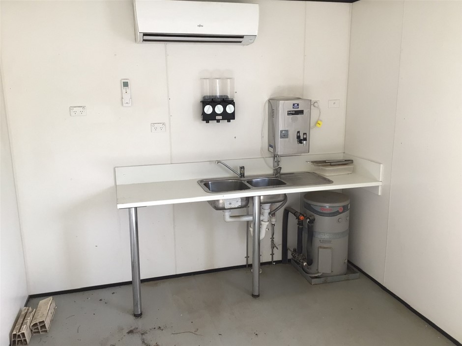 • Portable 12 m Building . Aluminium Clad Insulated walls on Steel Skid Frame . Features Door, 4 x Windows with Grates, Bench with Sink and Electric Hot Water Unit..