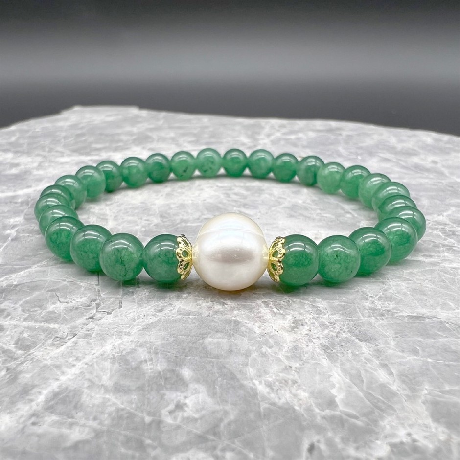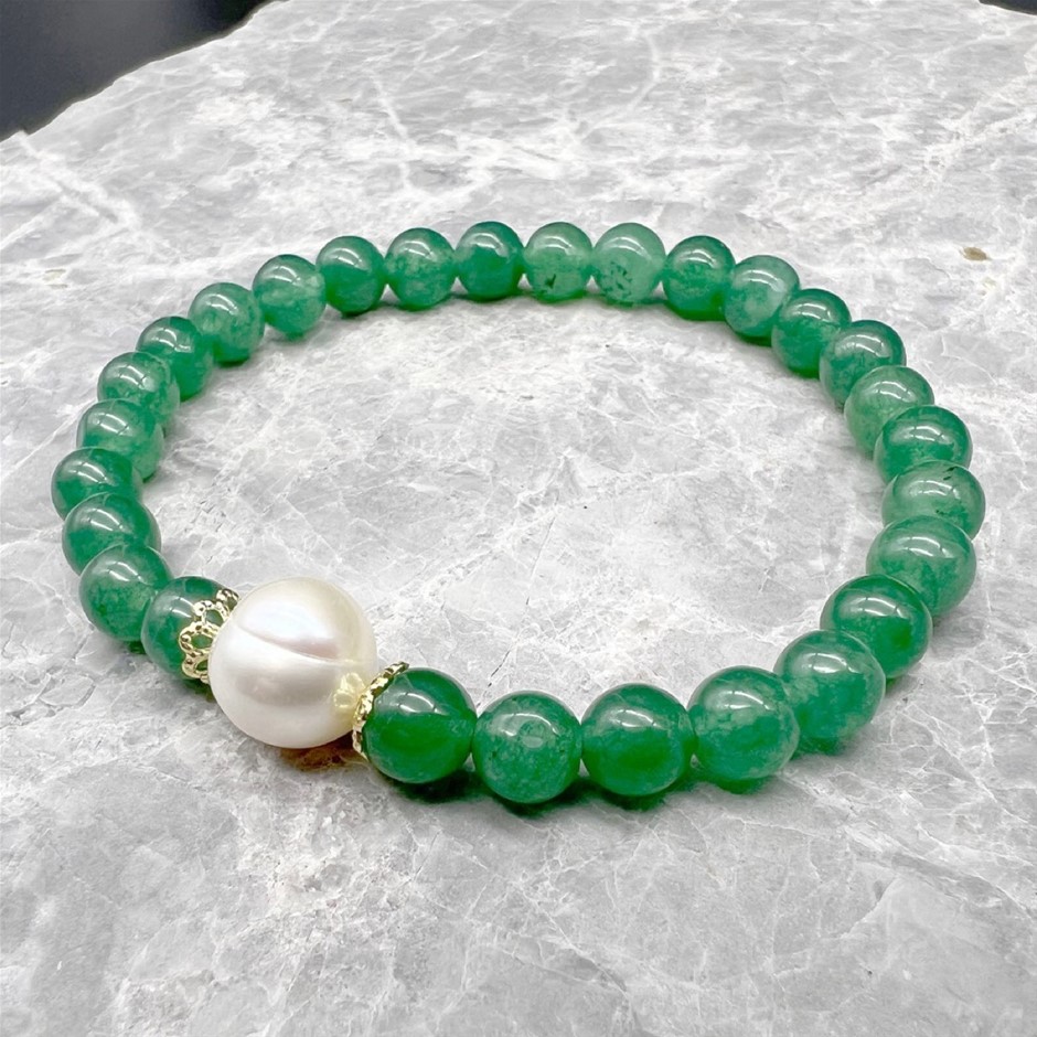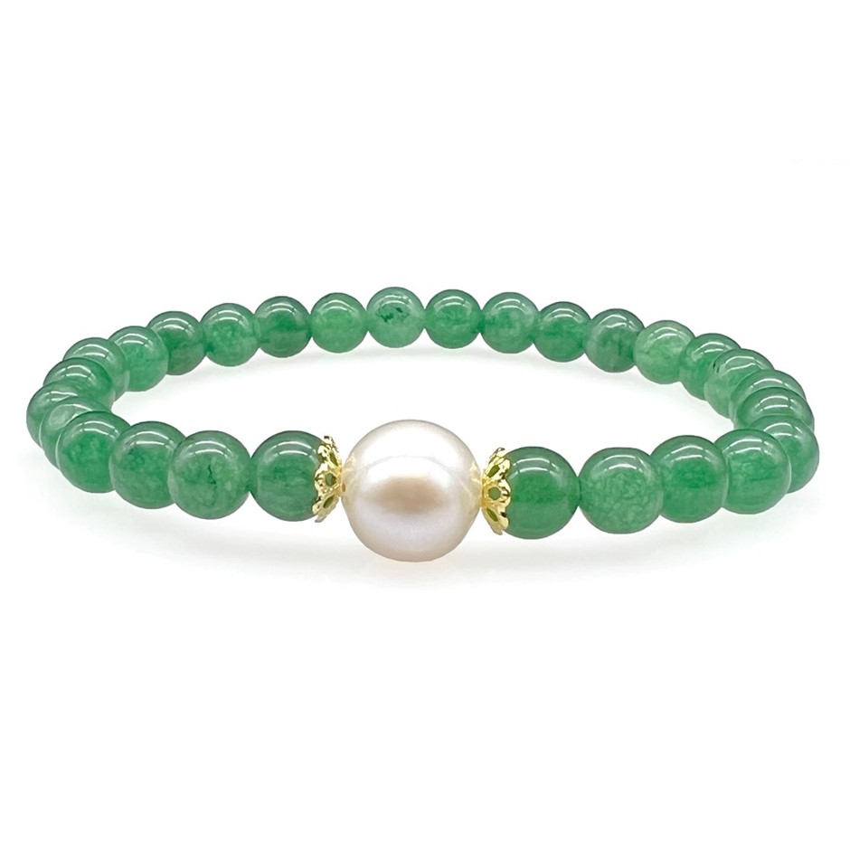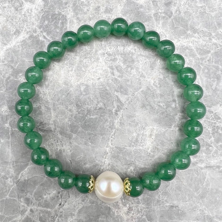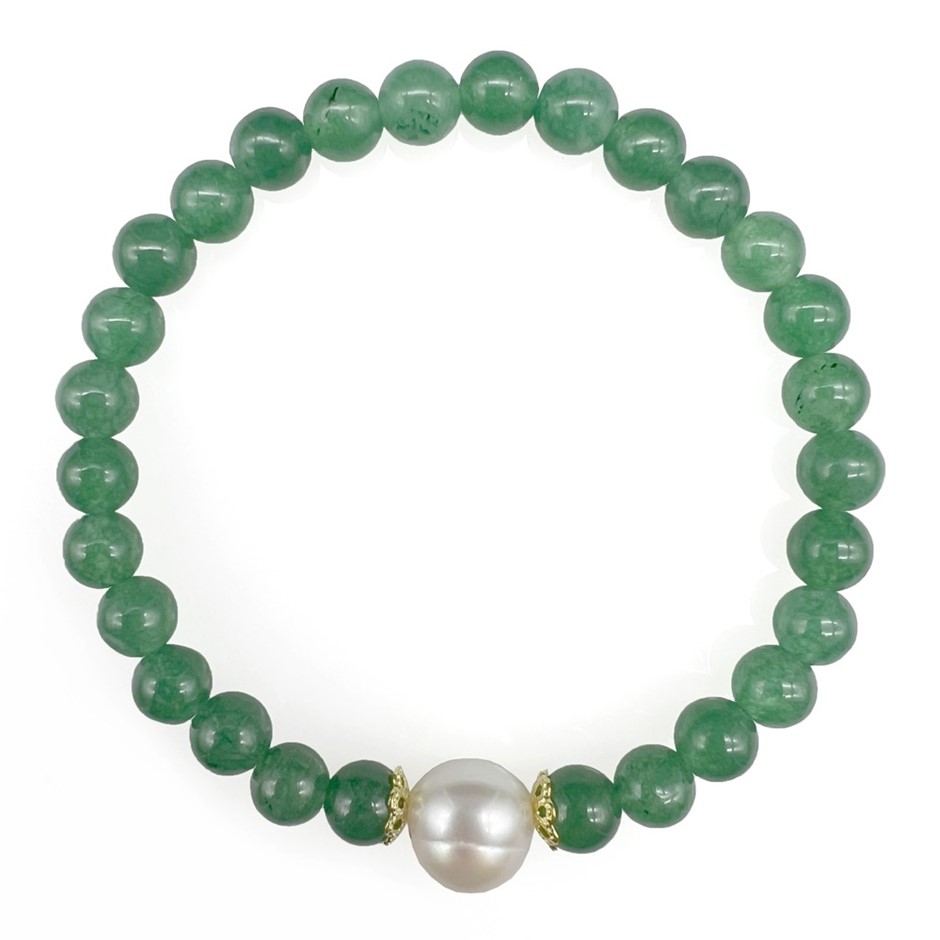 Natural 10mm White Freshwater Pearls with Green Aventurine Gemstone Bracelet. Product Specifications: