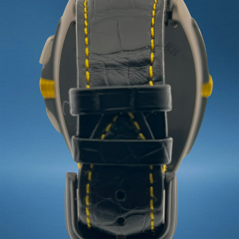 The Franck Muller Conquistador Grand Prix 8900 is a striking example of the brand’s bold design language, combining dynamic lines with a powerful wrist presence. Crafted in solid platinum, this 2012 model exemplifies Franck Muller’s dedication to innovative form and high-end finishing. The distinctive tonneau-shaped case and integrated dial details create a commanding aesthetic, while the contrasting numerals and sporty accents enhance legibility and character. A standout piece from the Conquistador Grand Prix series, it blends luxury materials with audacious styling.