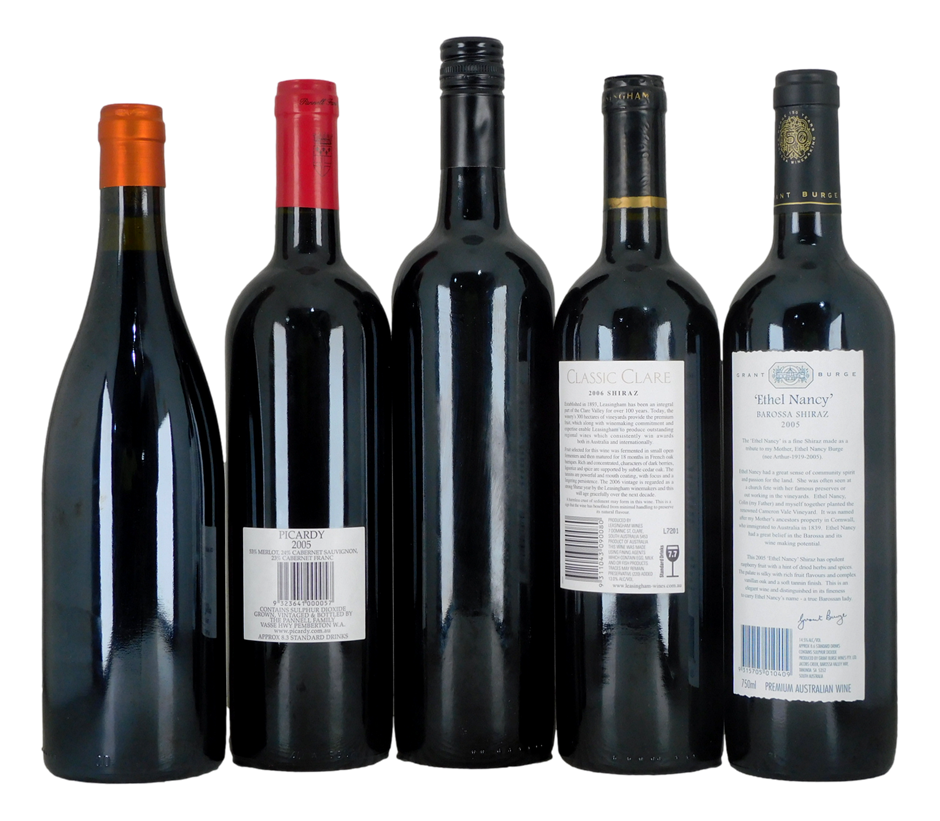 1x Leasingham Shiraz 20061x Piggs Peake House of Bricks Shiraz 20071x Picardy Merlot Cabernet Sauvignon Cabernet Franc 20051x Grant Burge Ethel Nancy Shiraz 20051x Vinea Marson Syrah 2006