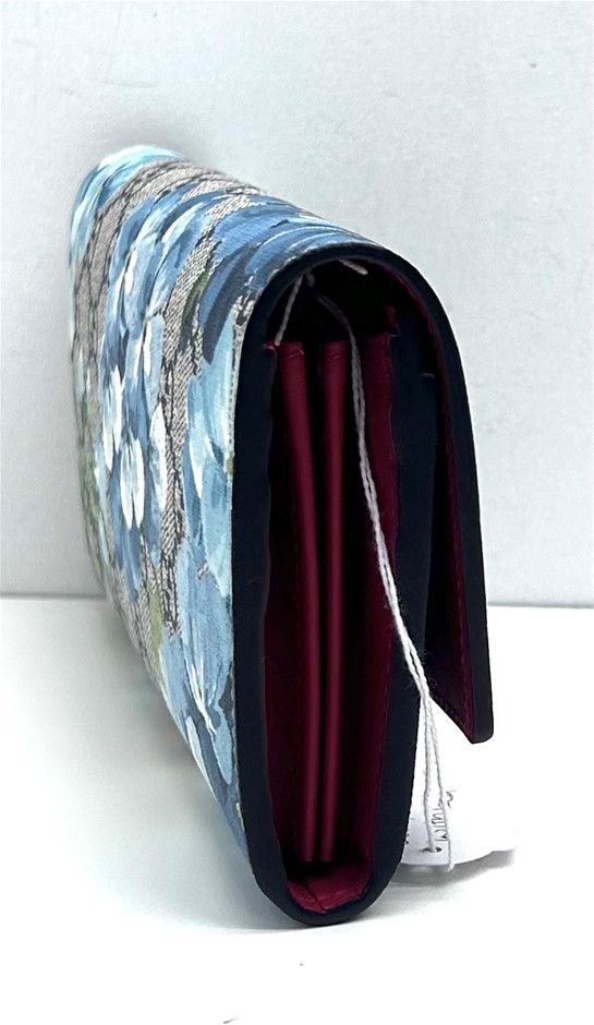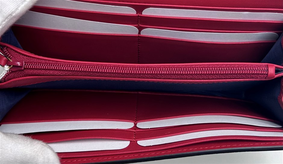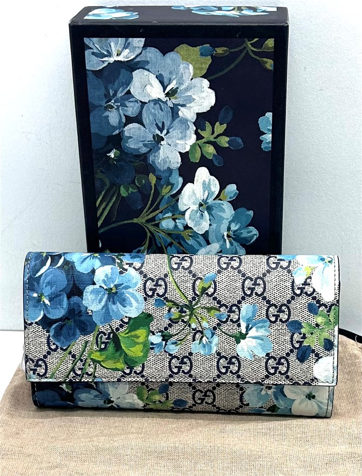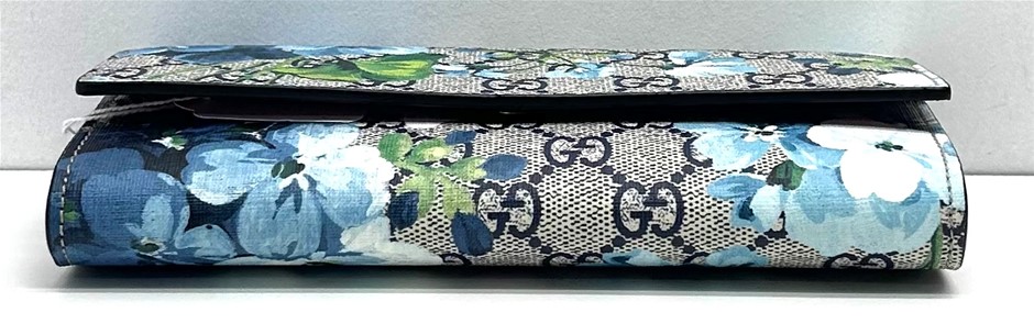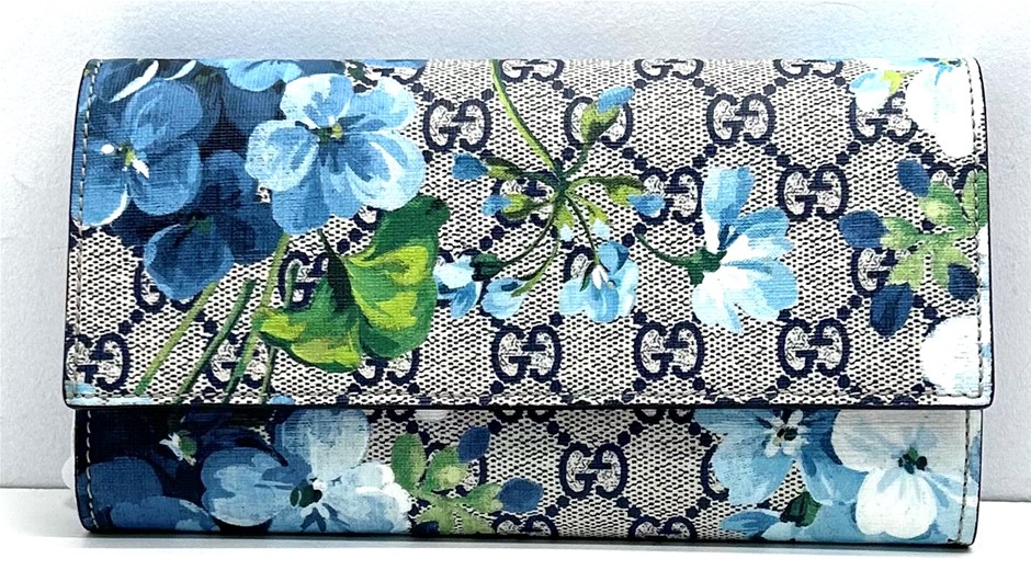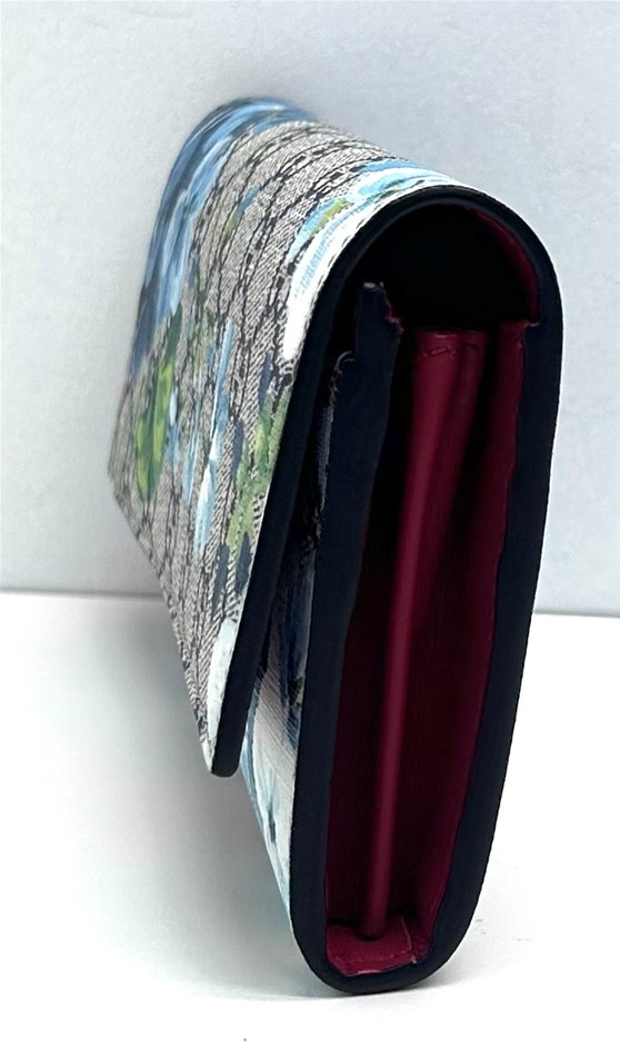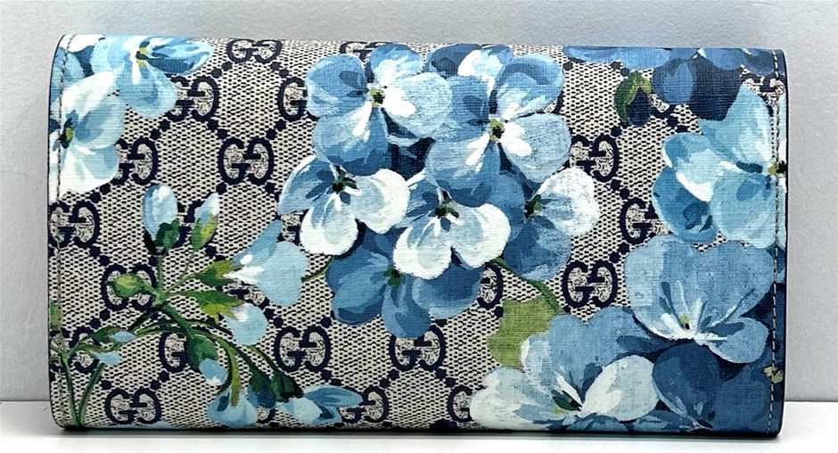 GG Supreme Monogram coated canvas in beige with blue floral patter overlay, fold over front flap with snap lock closure, front slip pocket under flap, internal red leather & blue wave textile lining, centre zip pocket with 2 separate compartments either side of zip, bank not compartment, 12 card slots, measures 19 x 10 x 2.5cm, dust cover & original box. This item has been professionally verified as a genuine product and comes with accompanying 3rd party Certificate of Authenticity (308884-6)