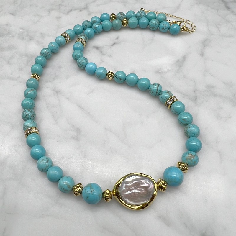 8mm Turquoise & Blister Pearl with Gold Trimming Beaded Necklace. Product Specifications: