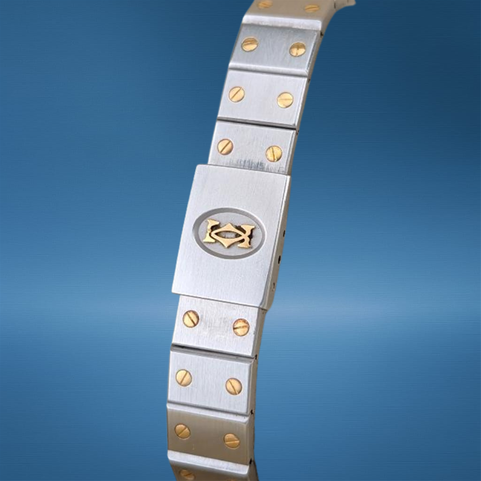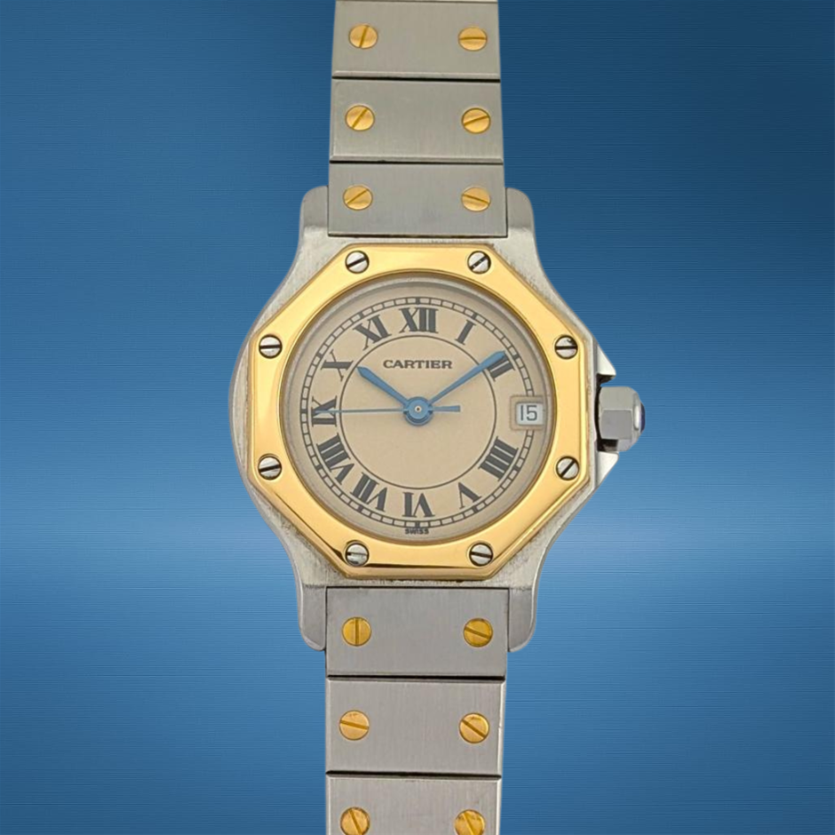 A distinctive expression of Cartier’s design innovation in the 1980s–1990s era, the Santos Octagon 187903 features a unique 8-sided case crafted in stainless steel and 18K yellow gold. This 25mm ladies’ model delivers timeless elegance with its Roman numeral dial, blued steel hands, and signature exposed screws.