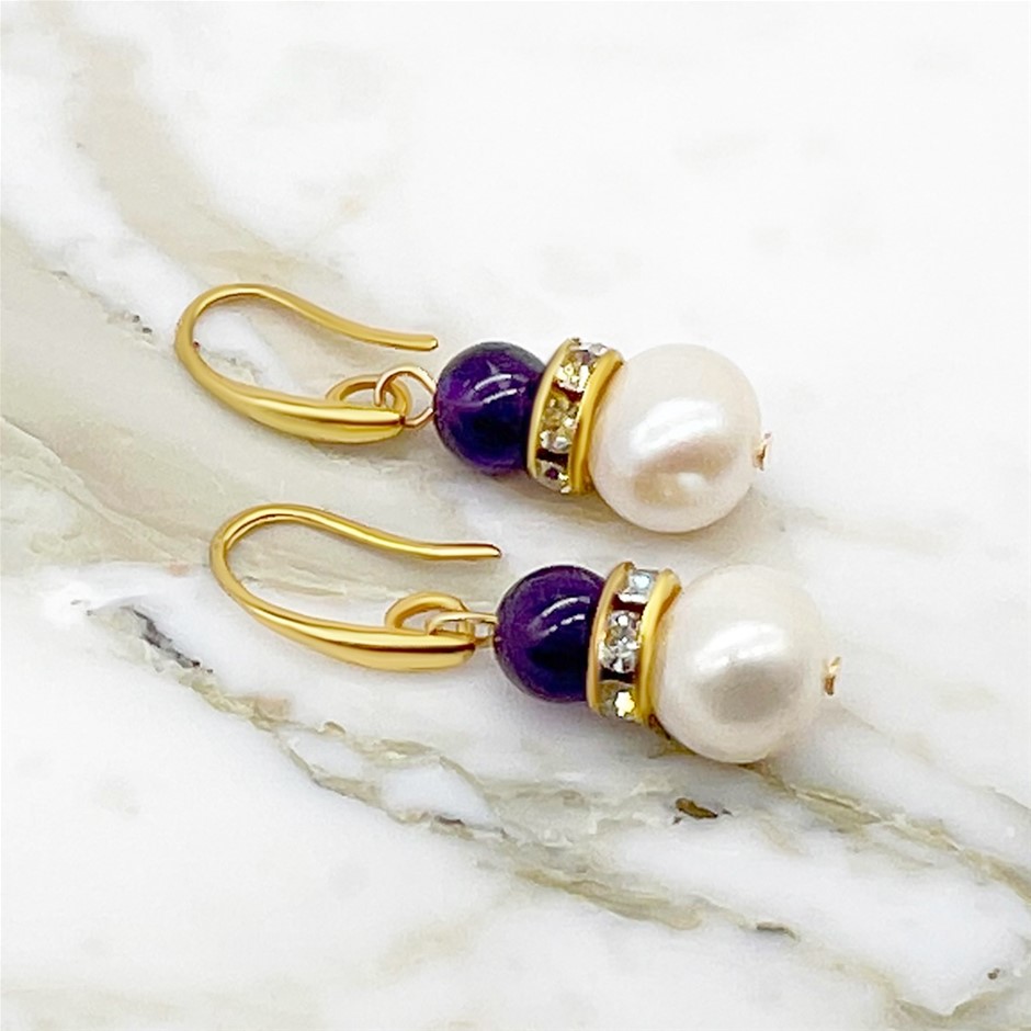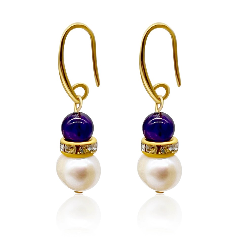 Amethyst & Freshwater Pearl Rhinestones Gold Plated Drop Earrings.