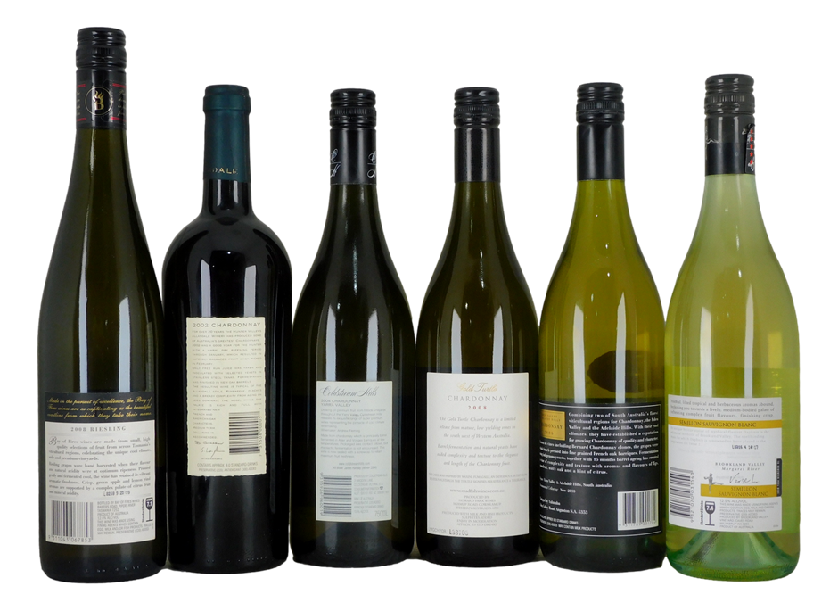 1x Mad Fish Gold Turtle Chardonnay 20081x Coldstream Hills Chardonnay 20041x Allandale Chardonnay 20021x Brookland Valley Verse 1 Semillon Sauvignon Blanc 20081x Yalumba Chardonnay 20061x Bay of Fires Riesling 2008