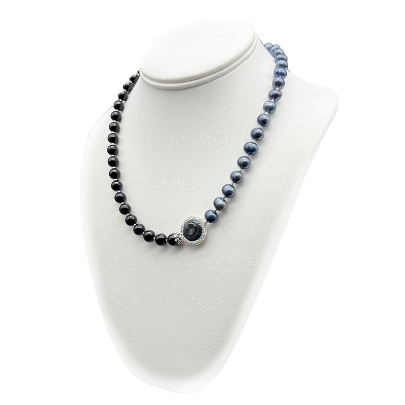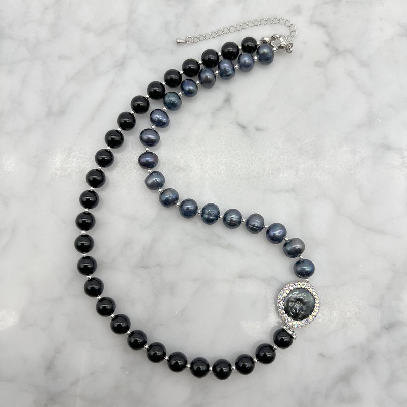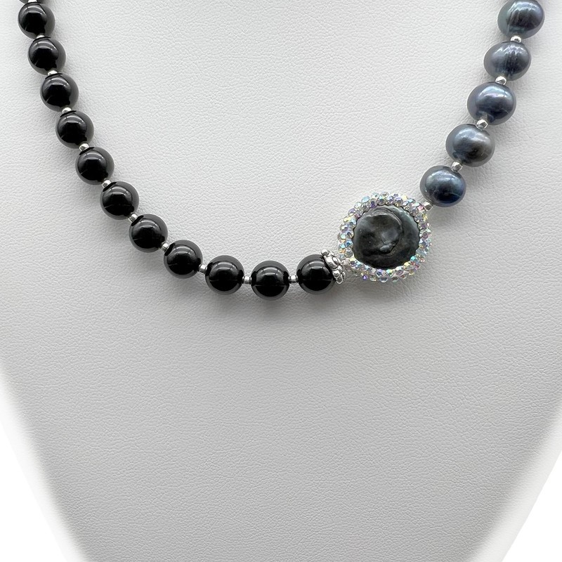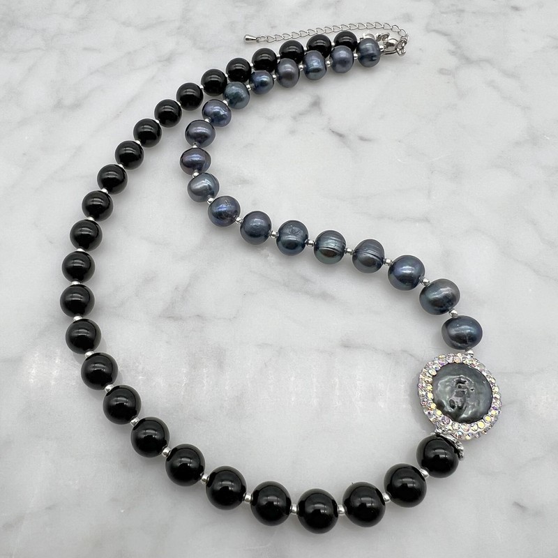 Natural Freshwater, Baroque Pearl & Black Agate with Real Platinum Plated Necklace.