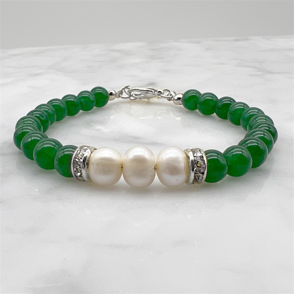 Natural 7-8mm Freshwater Pearl & Green Aventurine with Real Platinum Plated Bracelet