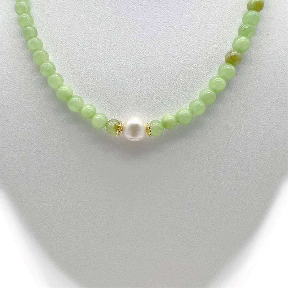 Natural 10mm White Freshwater Pearls with Flower Jade Quartz Gemstone Necklace. Product Specifications: