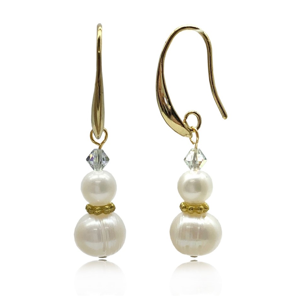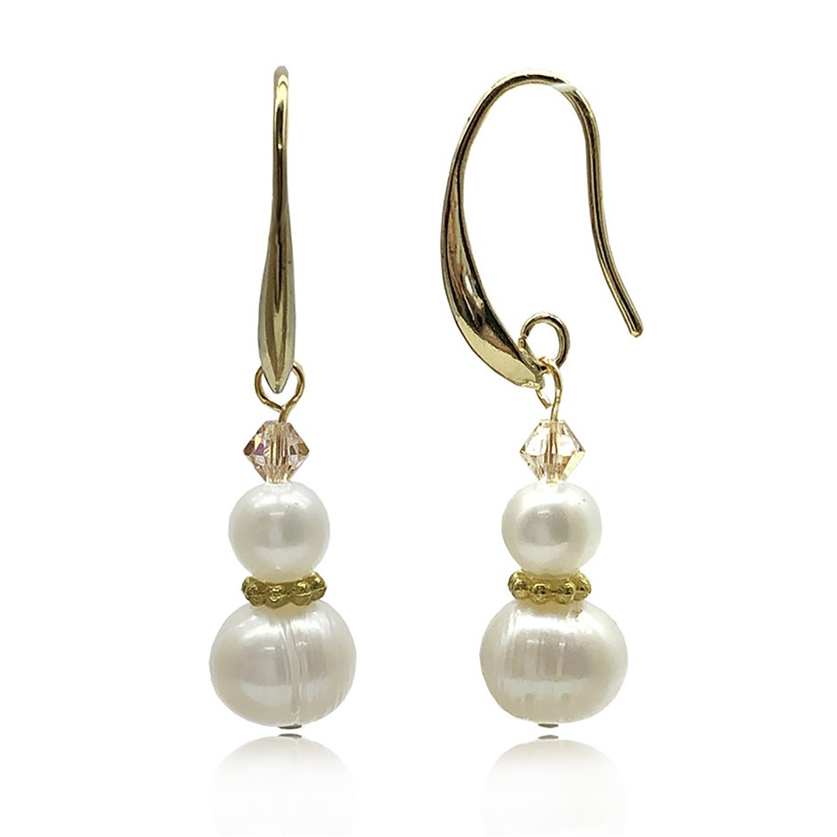 5-8mm Freshwater Pearl Adorned with Swarovski® Crystal & Real 18k Gold Plated Drop Earrings.