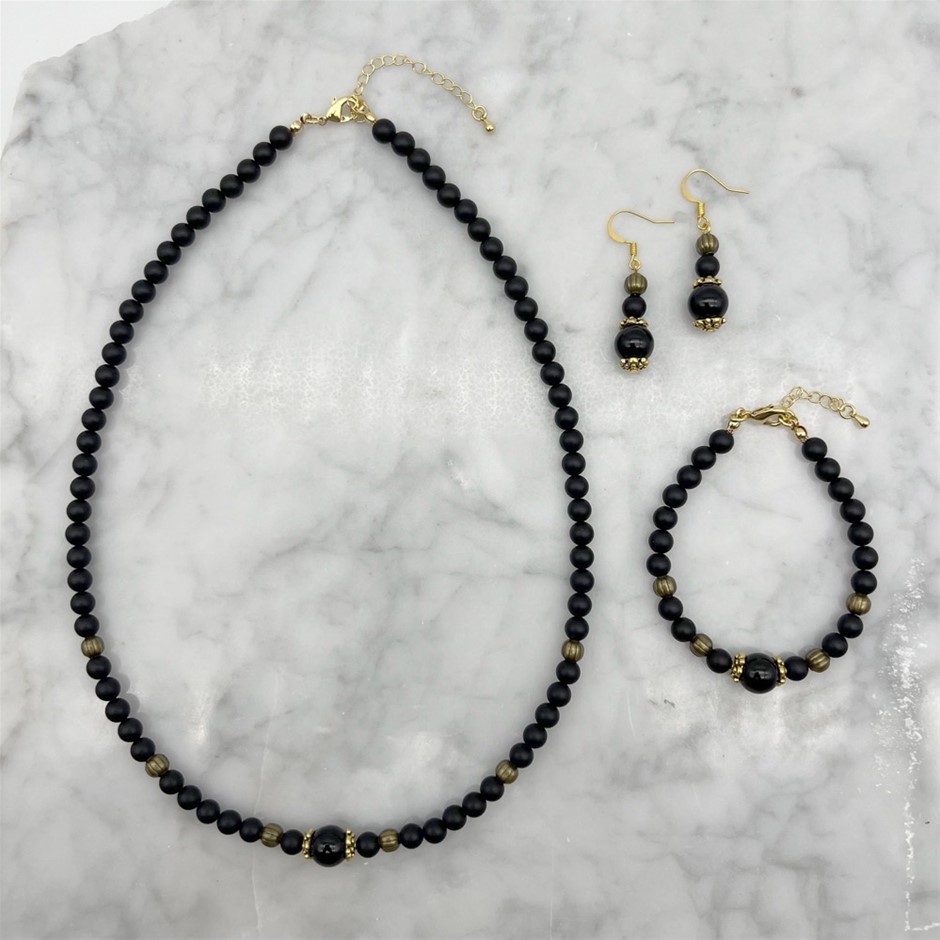6-10mm Natural Round Frosted Black Stone & Black Agate Beaded Gemstone Jewellery Set