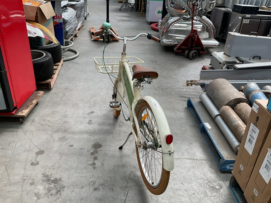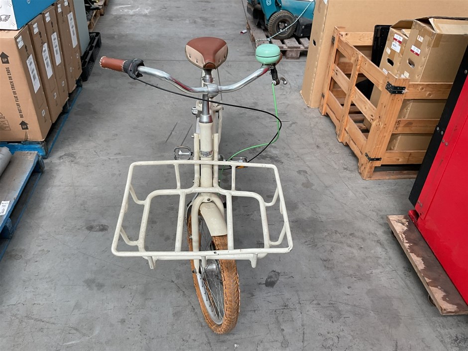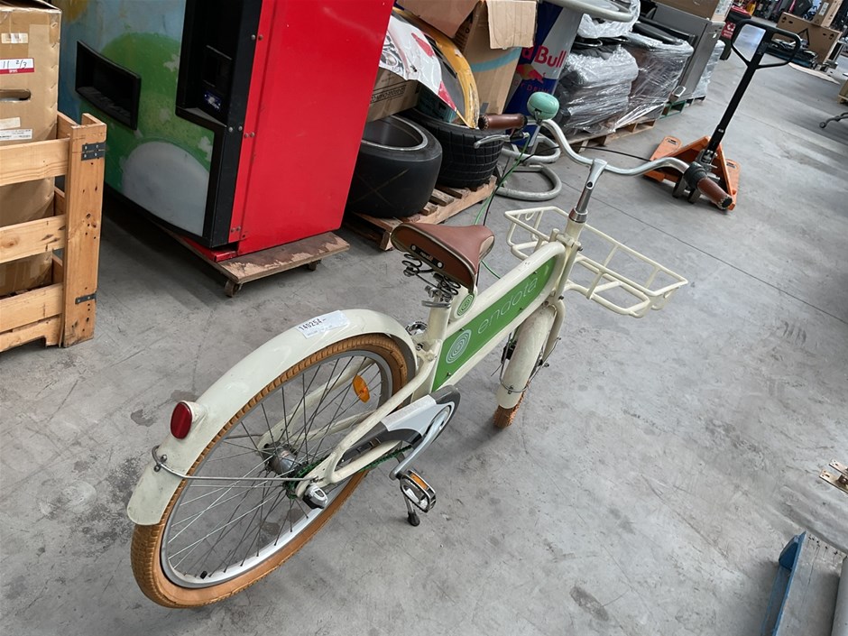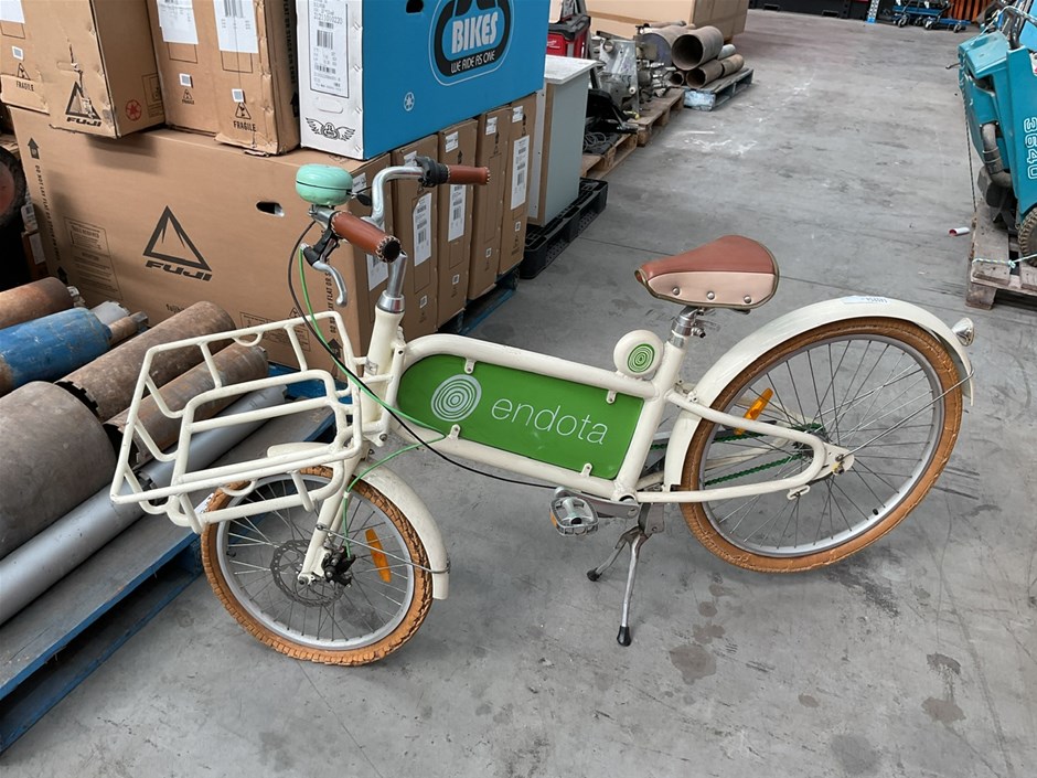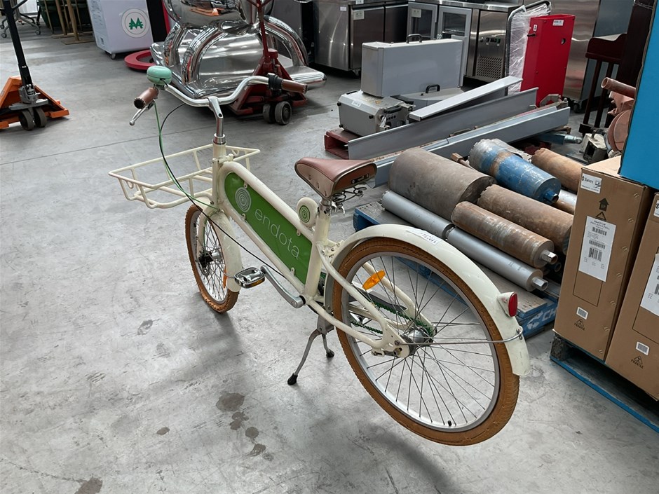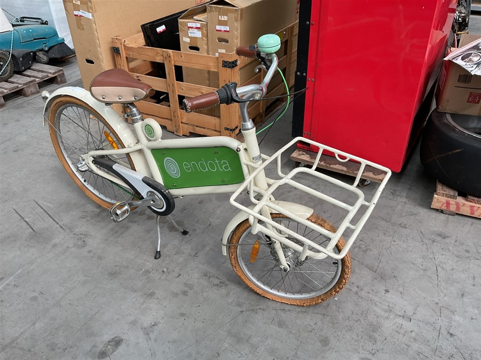 • ENDOTA Bike, White bike with Front carrier and bike stand.