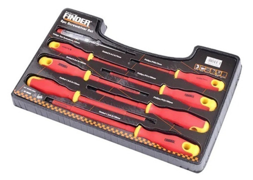 FINDER 8pc Insulated Screwdriver Set, 1000V. Sizes: Phillips: PH0x75mm, PH1x100mm, PH2x100mm. Slotted: 0.4x2.5x75mm, 0.8x4.0x100mm, 1.0x5.5x125mm, 1.2x6.5x150mm, and VoltageTest Screwdriver 140mm in Carry Case. (Code: 24MS001-0065) (334448-22)