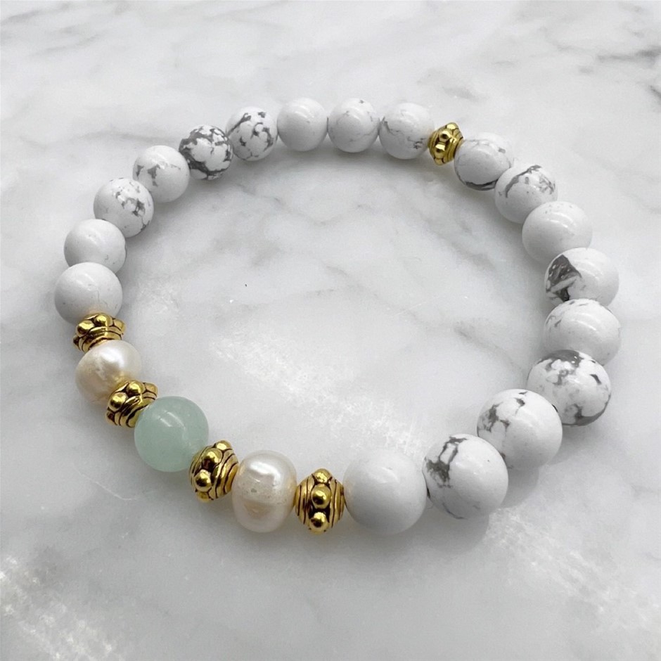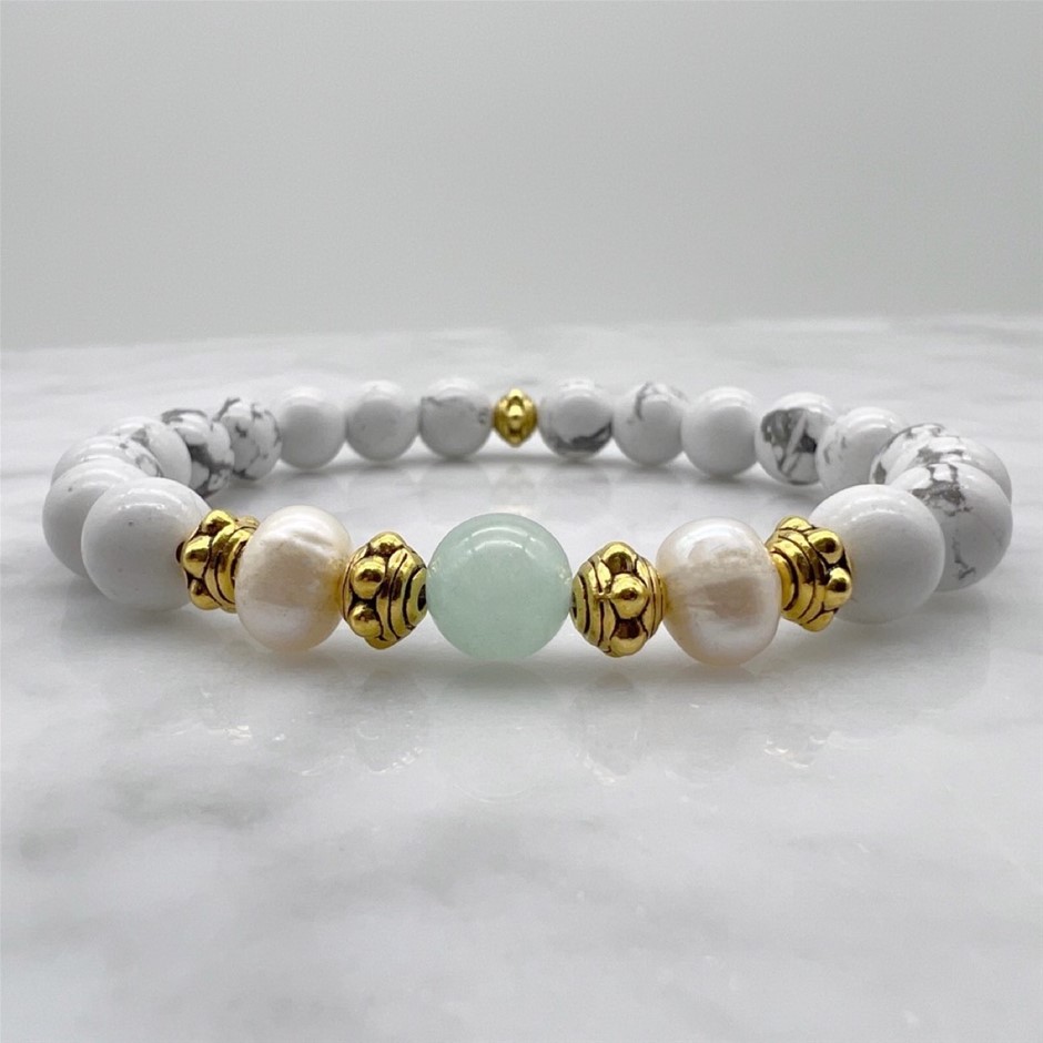 Natural Howlite , Malaysia `Jade` Quartz, Freshwater Pearls & Antique Gold Spacers Beaded Bracelet Product Specifications: