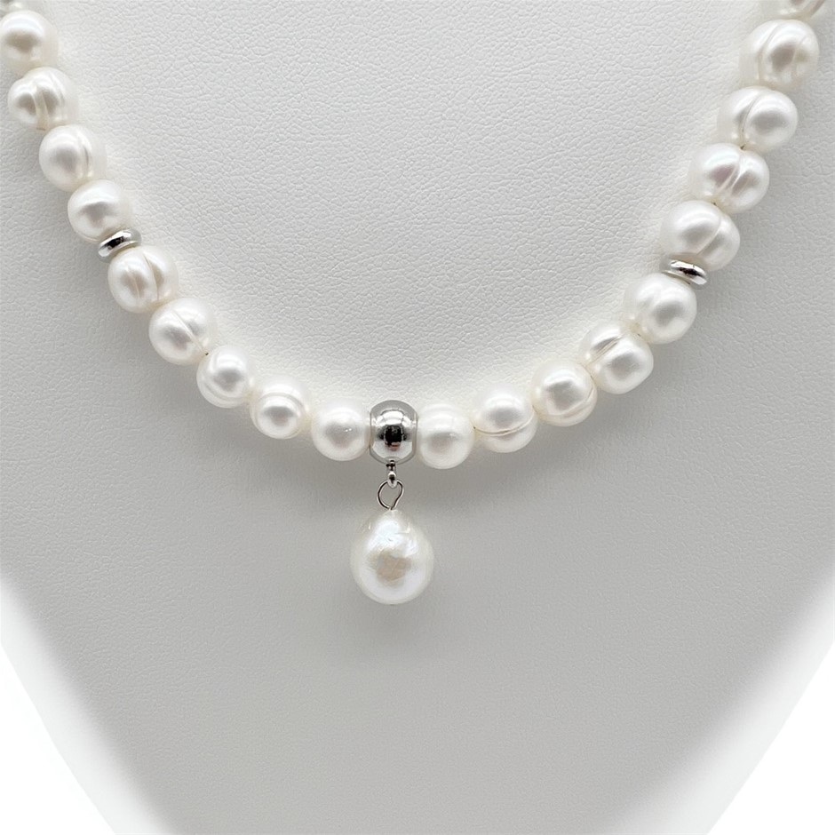 8-9mm Natural White Potato Freshwater Pearl with Baroque Pearl Teardrop Charm Pendant Necklace Product Specifications: