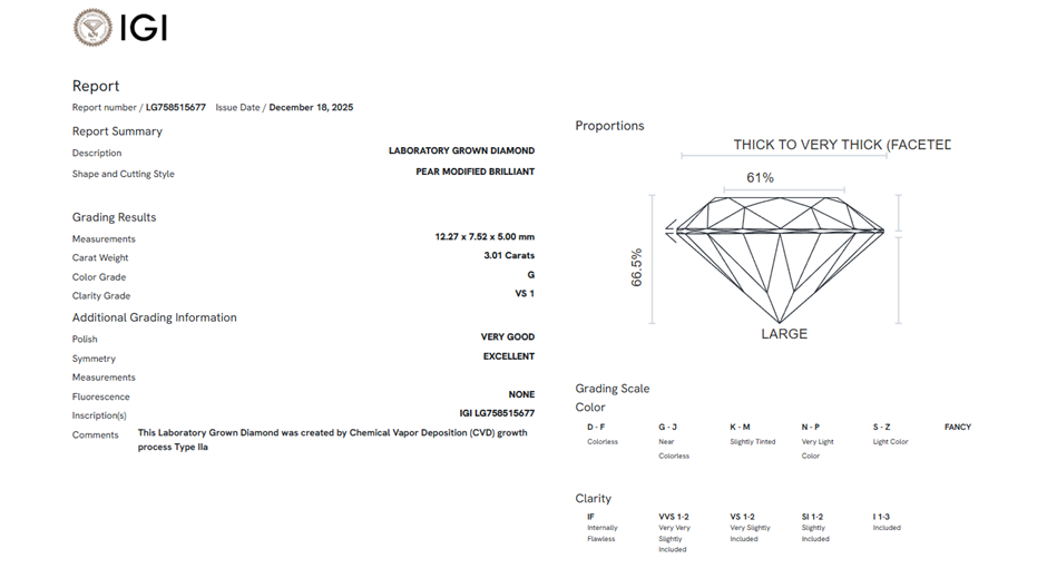 3.01 Carats G/VS1 Lab Grown Diamond - IGI Certified