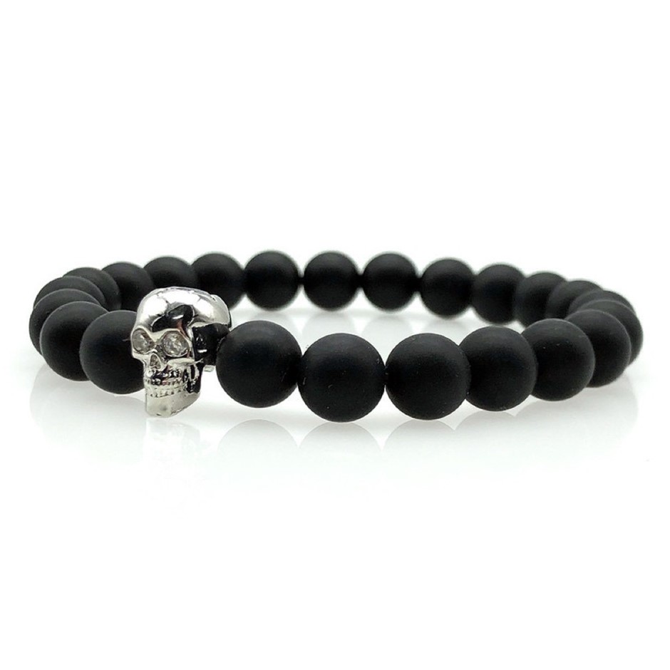 Men`s 8mm Natural Frosted Black Agate & AAA Grade Cubic Zirconia Skull Beaded Strethy Bracelet.