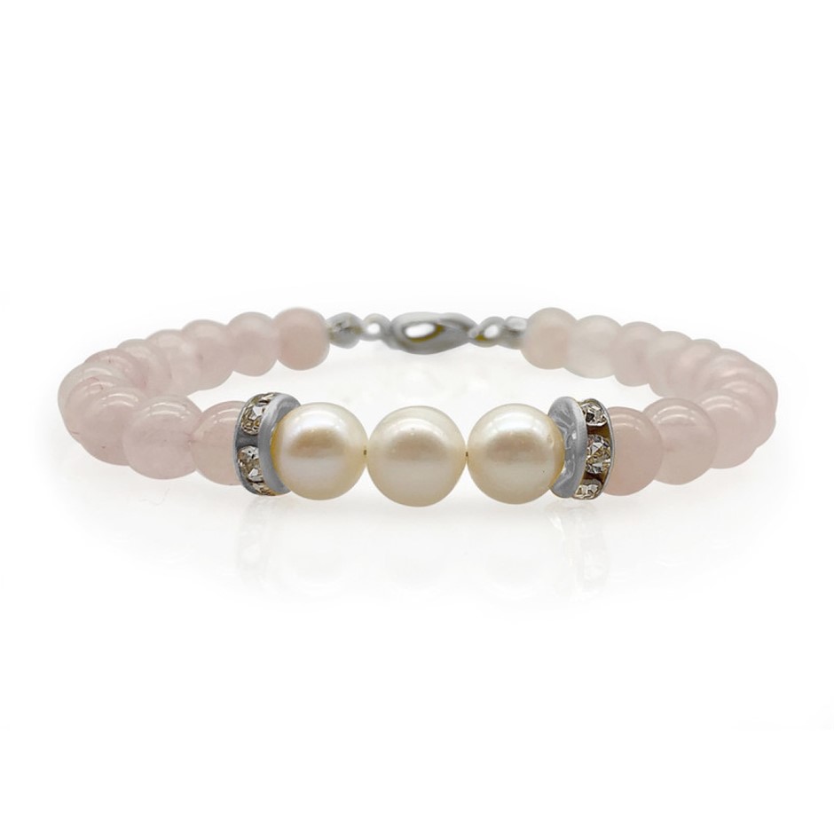 Natural 7-8mm Freshwater Pearl & Rose Quartz with Real Platinum Plated Necklace, Bracelet & Earring Set