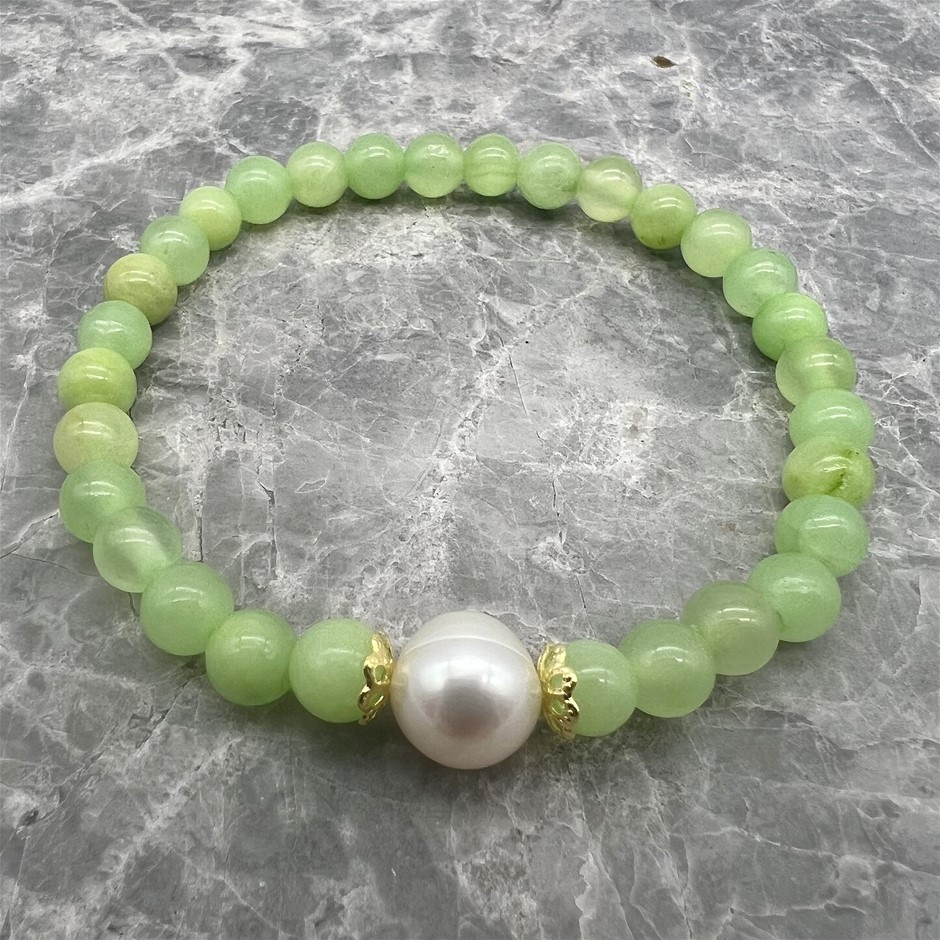 Natural 10mm White Freshwater Pearls with Flower Jade Gemstone Bracelet.Product Specifications: