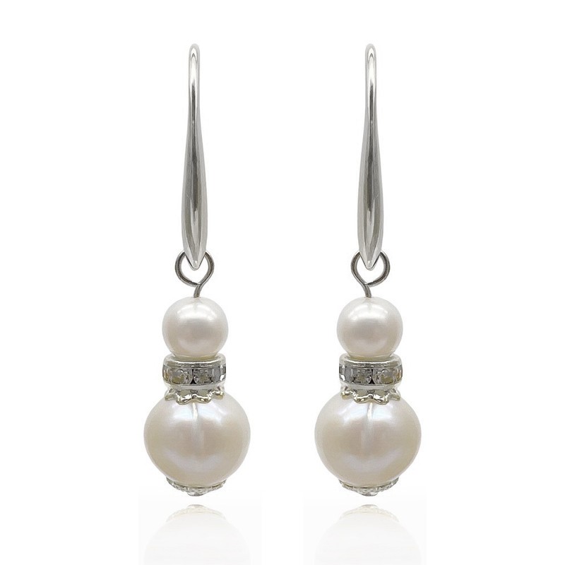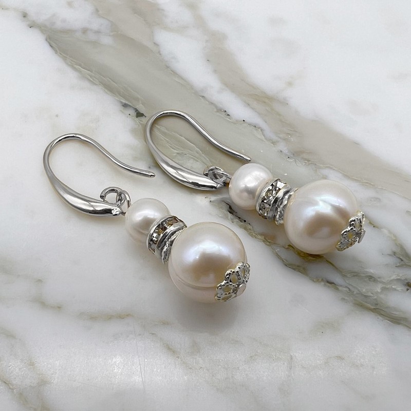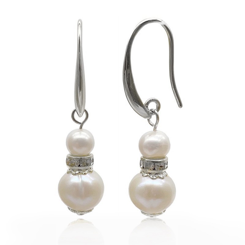 Natural 7-11mm White Freshwater Pearls & Rhinestone Real Platinum Plated Drop Earrings.