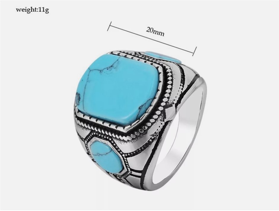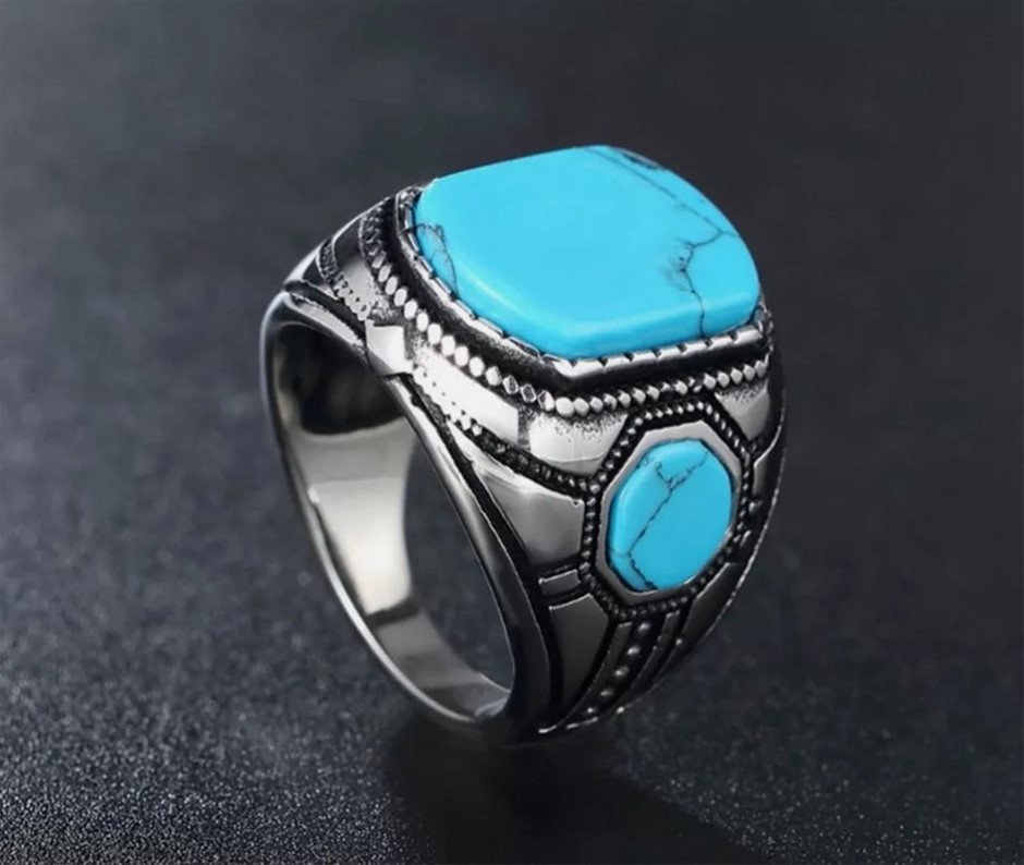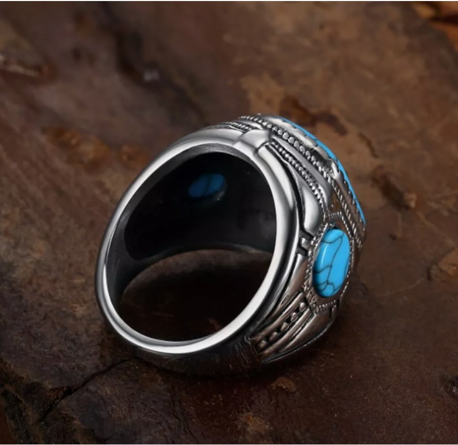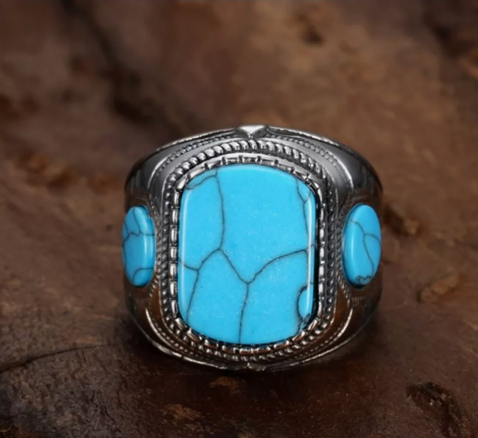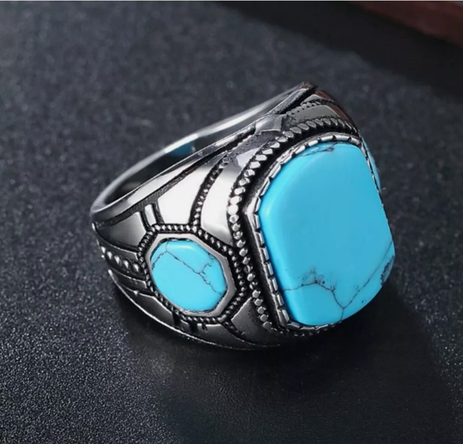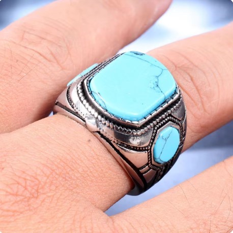 • This exquisite Turquoise/Feroza ring is crafted from 925 stamped silver and features three stunning turquoise (Feroza) stones. Designed and handmade by Boutique Ottoman, this luxurious piece is perfect for turquoise stone lovers. Handcrafted with care in Istanbul, Turkey, each ring is unique, and the stone colours may vary slightly, making each piece one-of-a-kind. A timeless and elegant addition to your jewellery collection, showcasing the beauty of Ottoman craftsmanship.