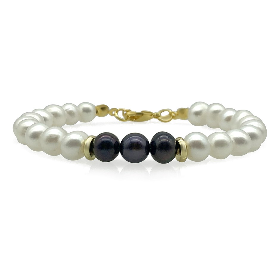 Luxury 7-8mm White & Black Freshwater Pearl with Real 18k Gold Plated Bracelet.