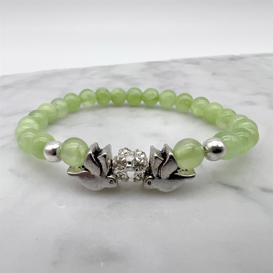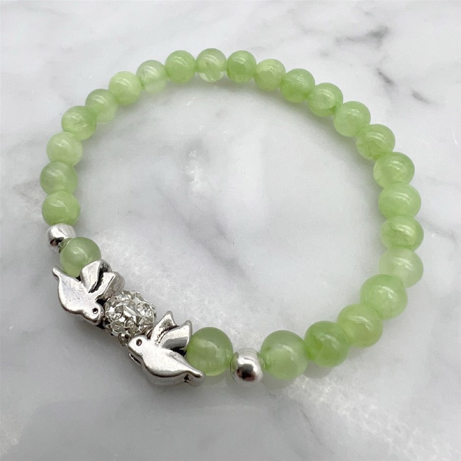 6mm Flower Jade Gemstone and Rhinestone Dove Bracelet