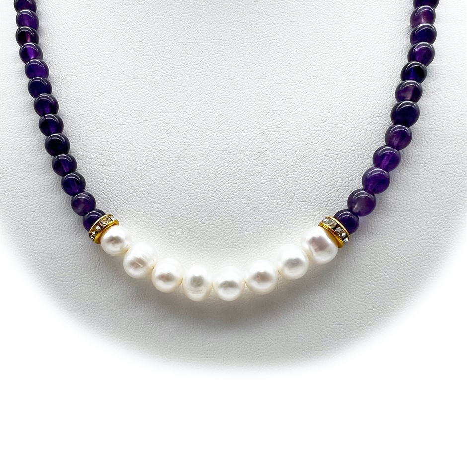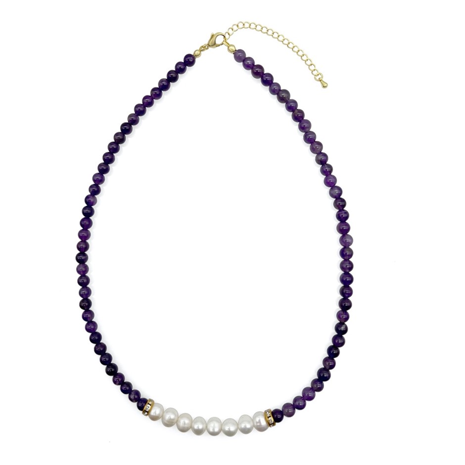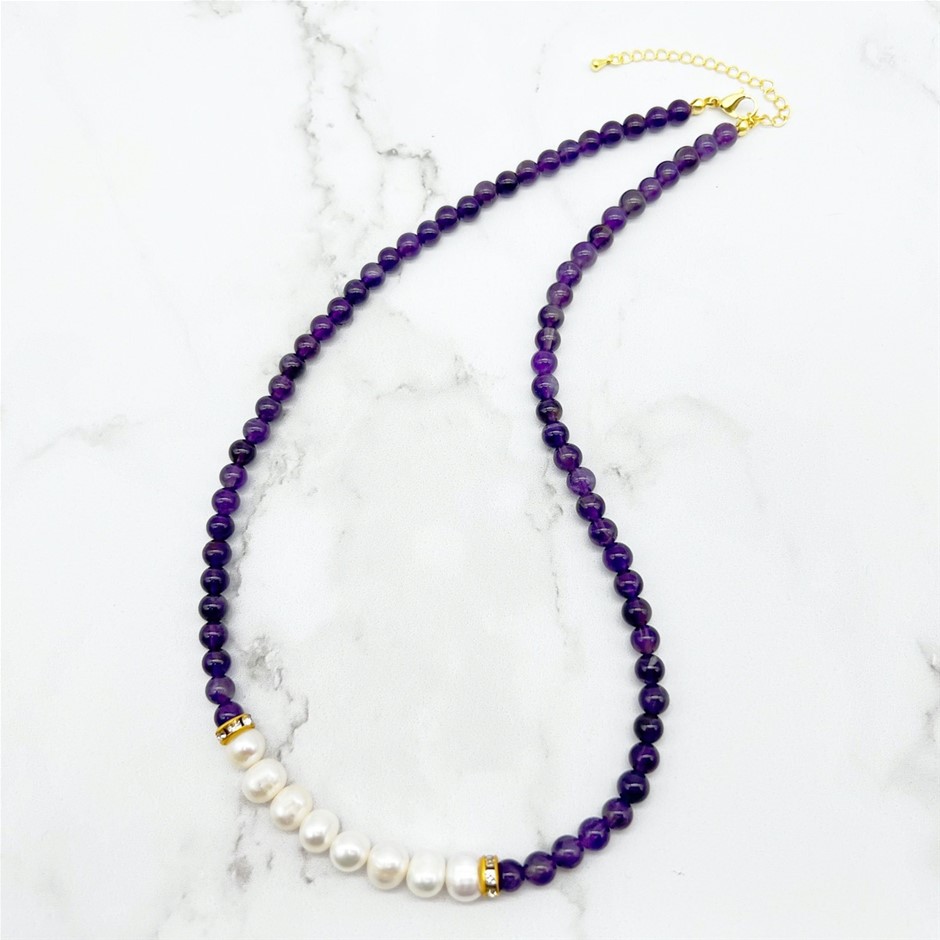 Natural 7-8mm Freshwater Pearl & Amethyst with Real 18k Gold Plated Necklace.