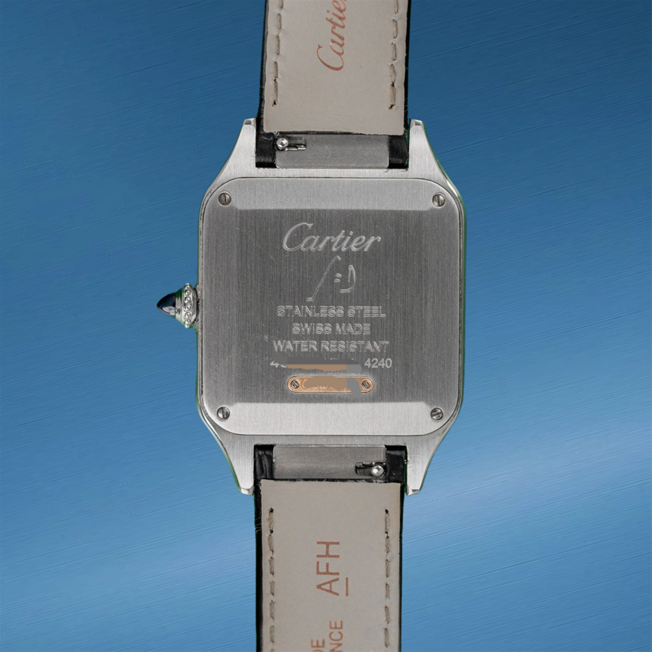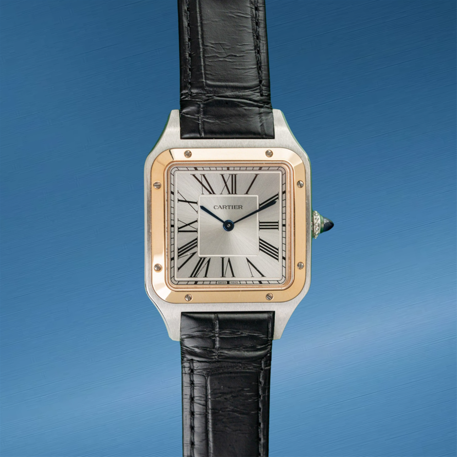 The Cartier Santos Dumont W2SA0011 pairs elegant two-tone styling with the classic Santos silhouette, marrying Cartier heritage design with refined proportions. Its blue dial and signature Roman numerals deliver timeless sophistication in a versatile dress-watch format.