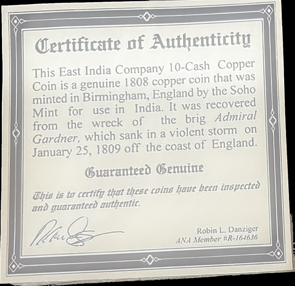 1808 East India Company Shipwreck coin with certificate of Authenticity (309656-25)