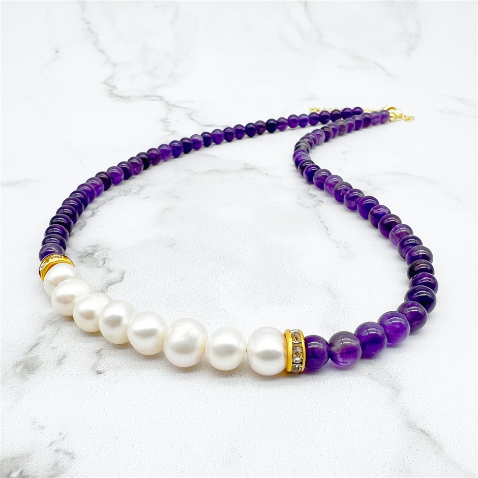 Natural 7-8mm Freshwater Pearl & Amethyst with Real 18k Gold Plated Necklace.