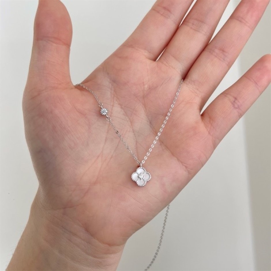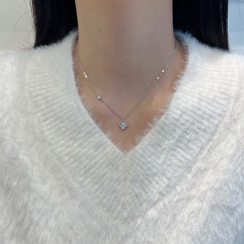 0.13ct GRA Certified Moissanite & White Shell Clover Pendant Necklace