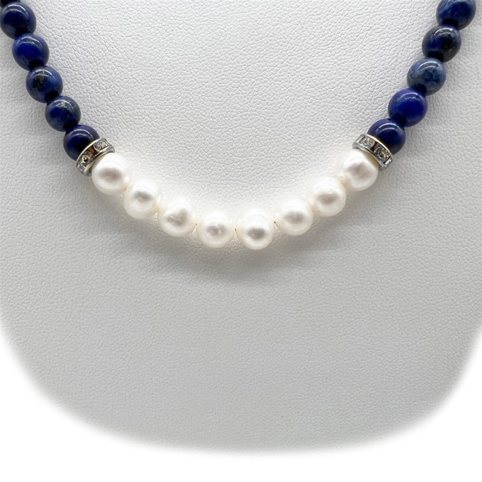 Natural 7-8mm Freshwater Pearl & Lapis Lazuli with Real Platinum Plated Necklace, Bracelet & Earring Set