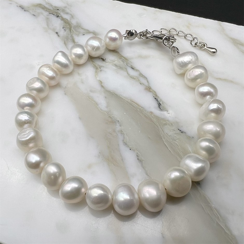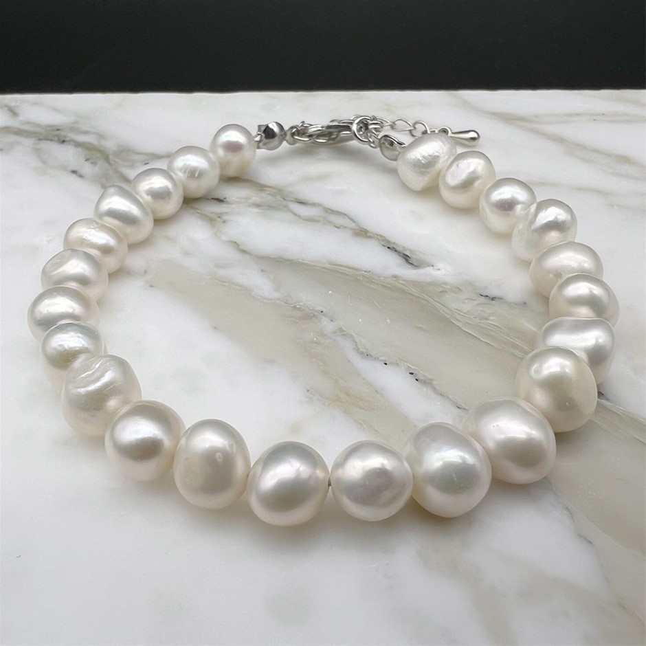 Natural Mix Shape 7-8mm White Freshwater Pearls Platinum Plated Bracelet.