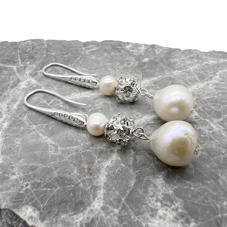 10 x 12mm Baroque Pearl & Rhinestone Silver Plated Drop Earrings