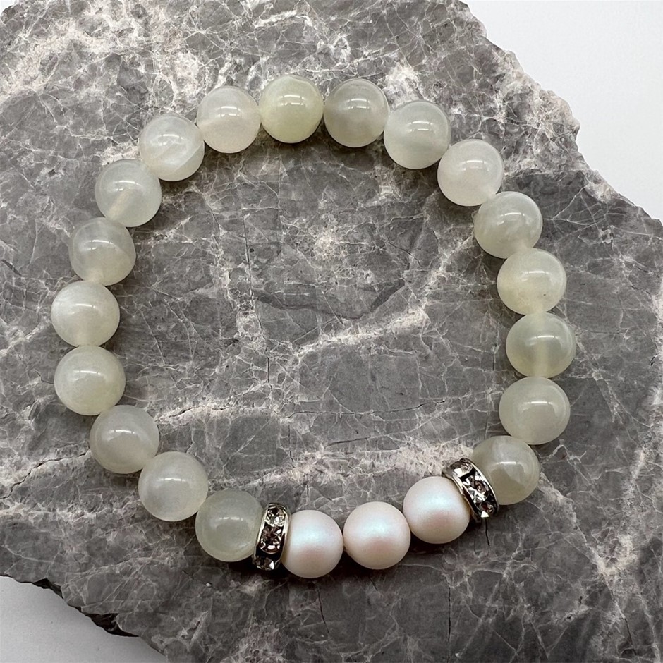 8mm Natural Moonstone & Swarovski® Crystal Pearl Rhinestone Beaded Bracelet. Product Specifications: