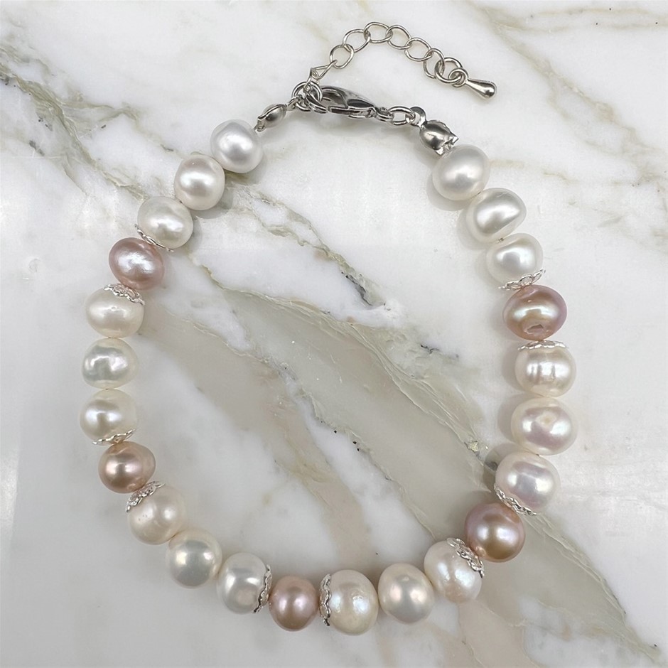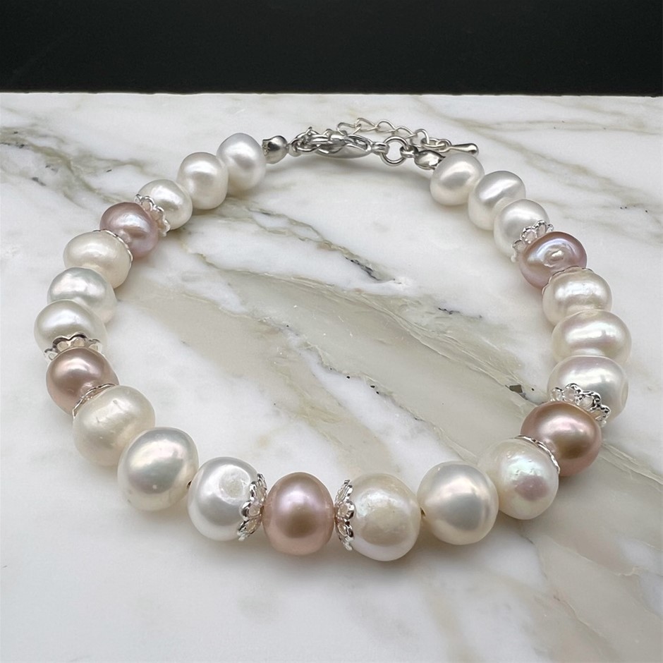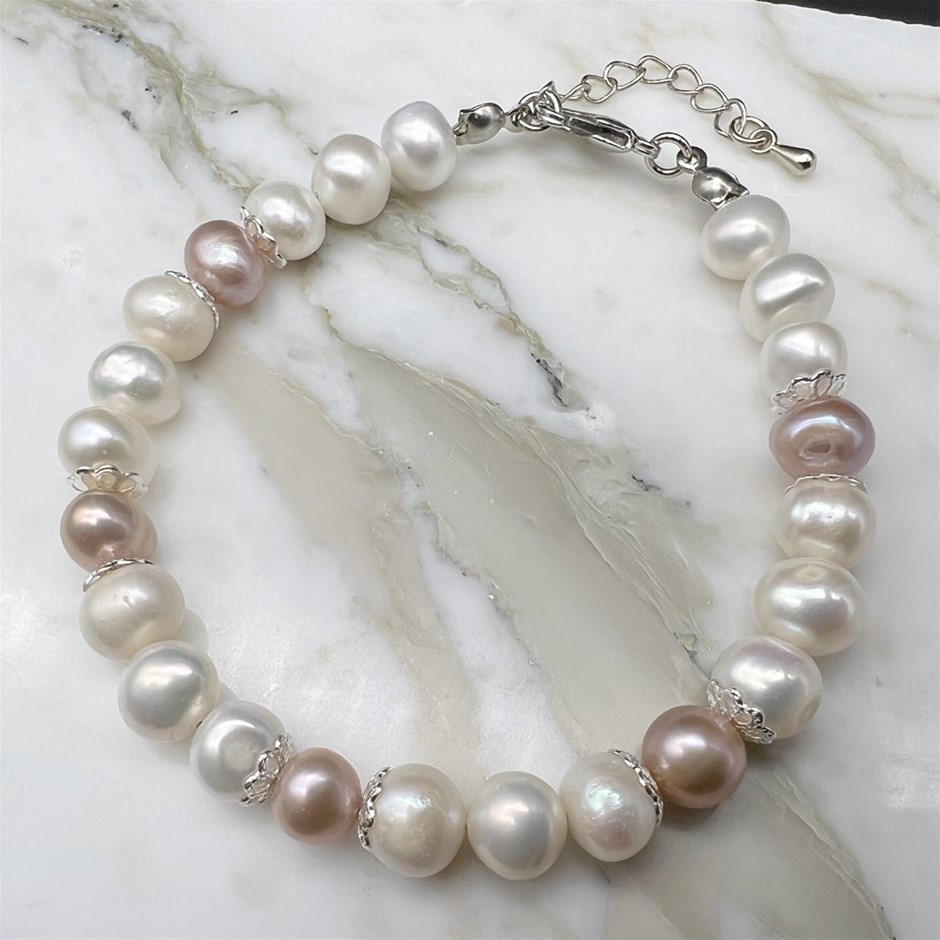 Natural Mix Shape 7-8mm White & Pink Freshwater Pearls Platinum Plated Bracelet.