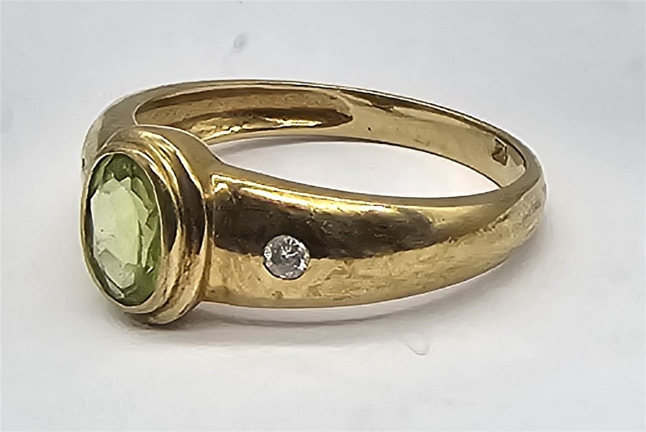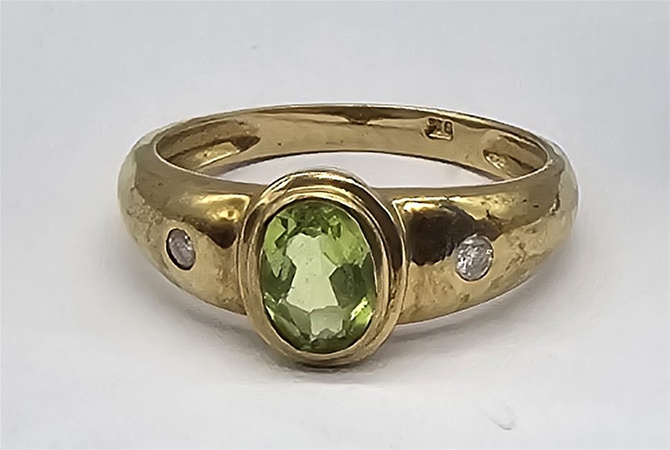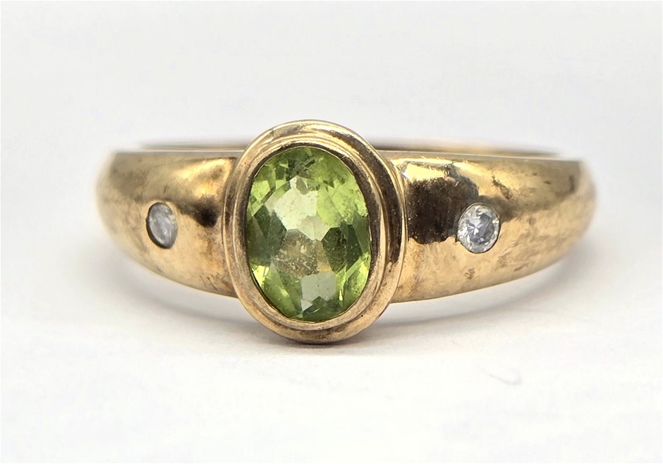 • 9 Carat Yellow Dress Ring with a Central Peridot Surrounded by Two Diamonds