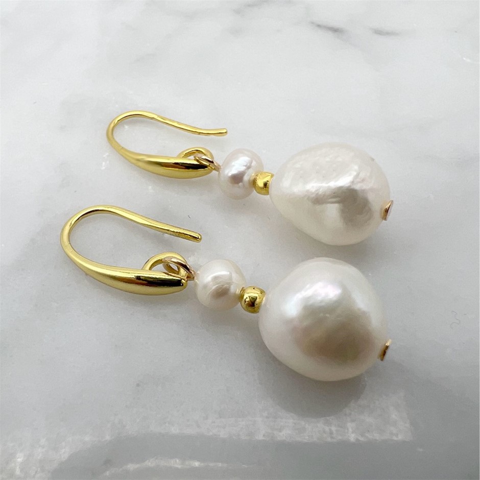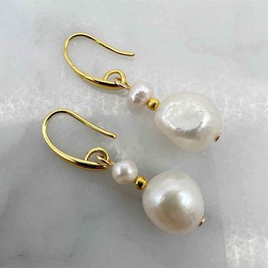 Flat Edge Baroque & Freshwater Pearl Gold Plated Drop Earrings.