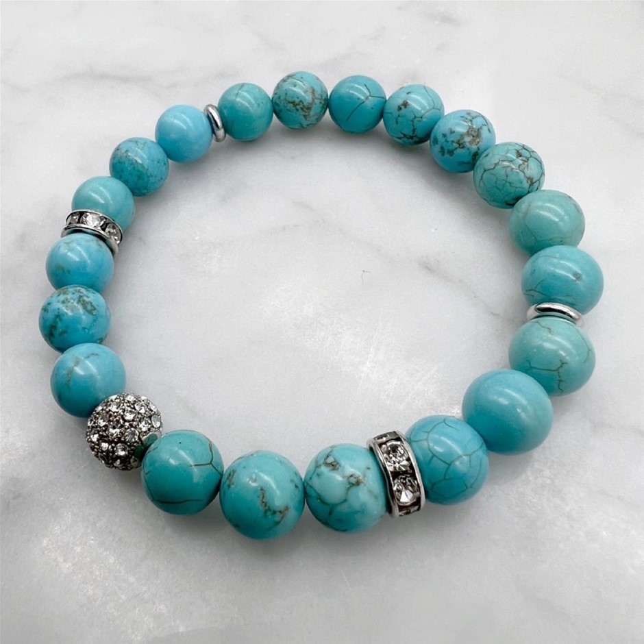 8mm Turquoise with Rhinestones Platinum Plated Beaded Bracelet.Metal: Brass.Stone: Turquoise.Colour: Turquoise Blue & Platinum.Shape: RoundSpacer Beads: 8mm Rhinestone Bead & Flat BeadTreatment: Dyed.Length of Bracelet: 18cm Presented in a beautiful organza jewellery pouch.A beautiful gift for Birthday`s, Anniversary`s, Christmas, Brides, Bridesmaid`s Gifts, Mother of the Bride, Graduation`s, Mother`s Day, Valentine`s Day or for someone very special.PLEASE NOTE: NATURAL GEMSTONES AND PEARLS MAY VARY IN COLOR, PATTERN, AND TEXTURE, AS THEY ARE PRODUCTS OF NATURE. EACH STONE OR PEARL IS UNIQUE, AND SLIGHT DIFFERENCES SHOULD BE EXPECTED AND EMBRACED AS PART OF THEIR NATURAL BEAUTY AND AUTHENTICITY.30 DAY MANUFACTURER WARRANTY AGAINST ANY DEFECTS.**EXQUISITE JEWELLERY THAT IS MADE IN AUSTRALIA**