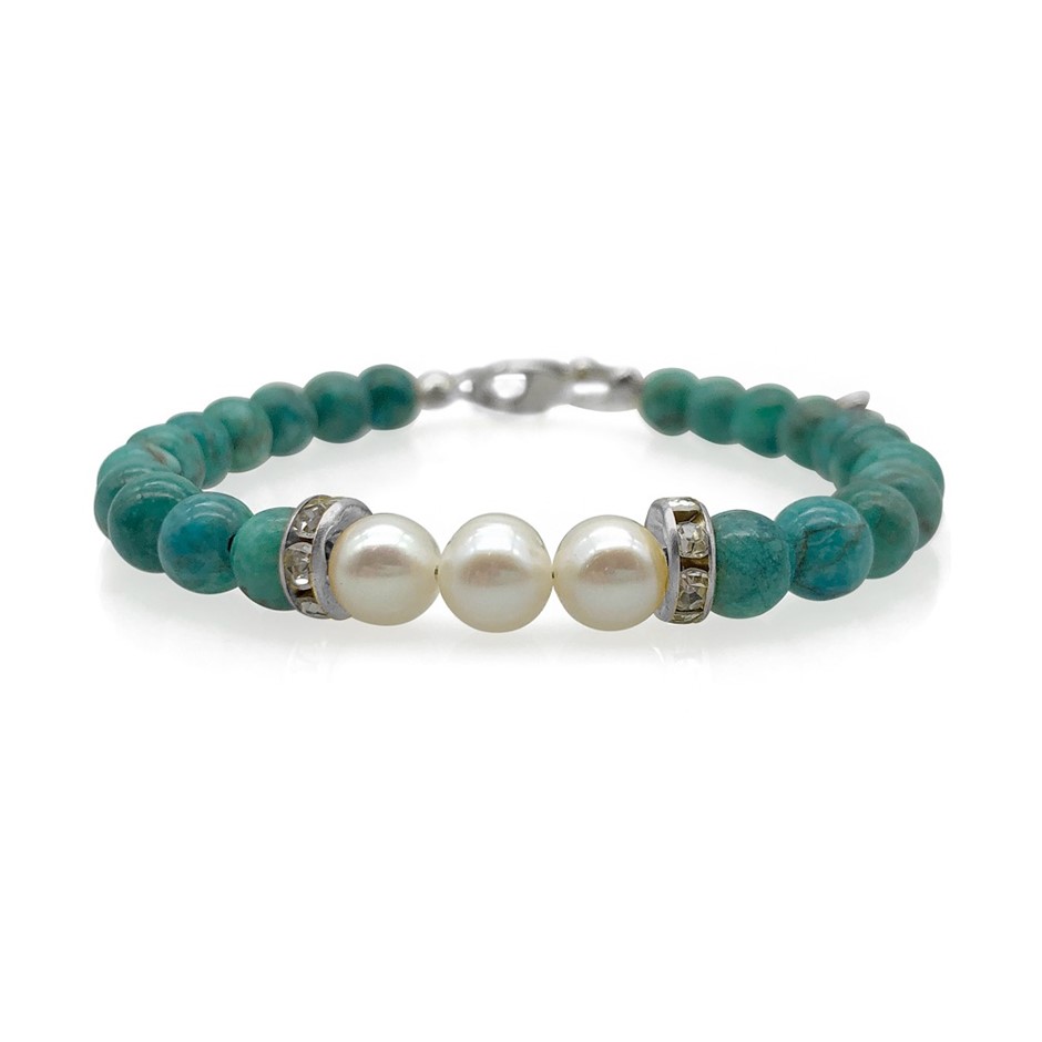 Natural 7-8mm Freshwater Pearl & African Jasper Turquoise with Real Platinum Plated Bracelet.