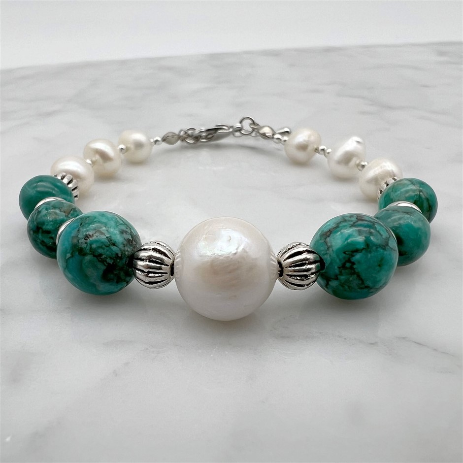 Large Central 13mm White Freshwater Pearl, Afican Jasper `Turquoise` Platinum Plated Bracelet.