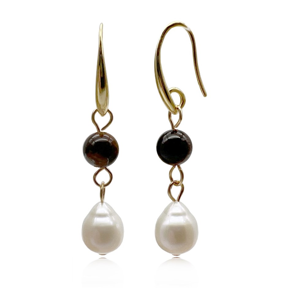 6mm Tiger Eye & Baroque Pearl Dangling Earrings.